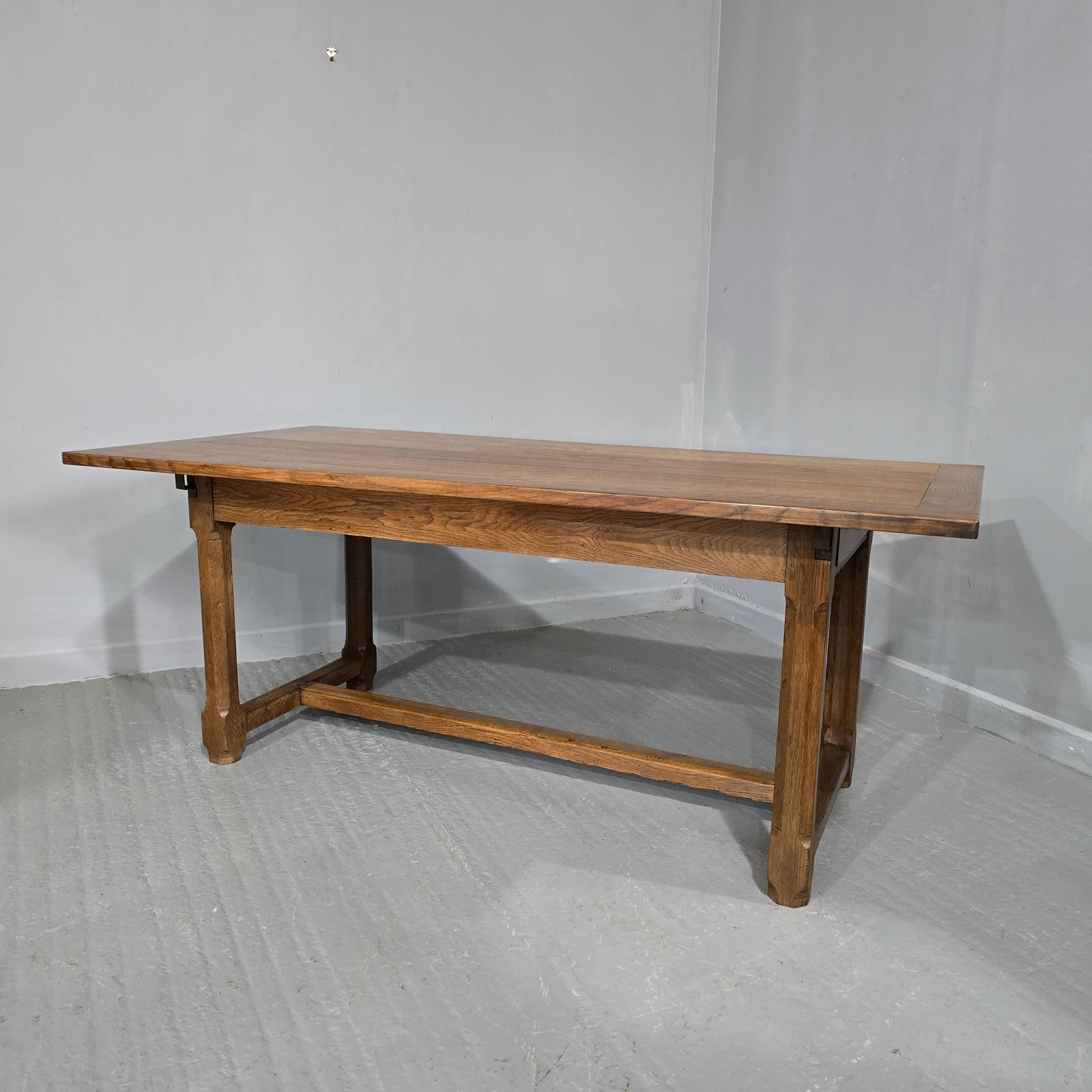 An excellent four plank solid oak French country dining table with drawers either end, and deep overhang. excellent colour, waxed finish.