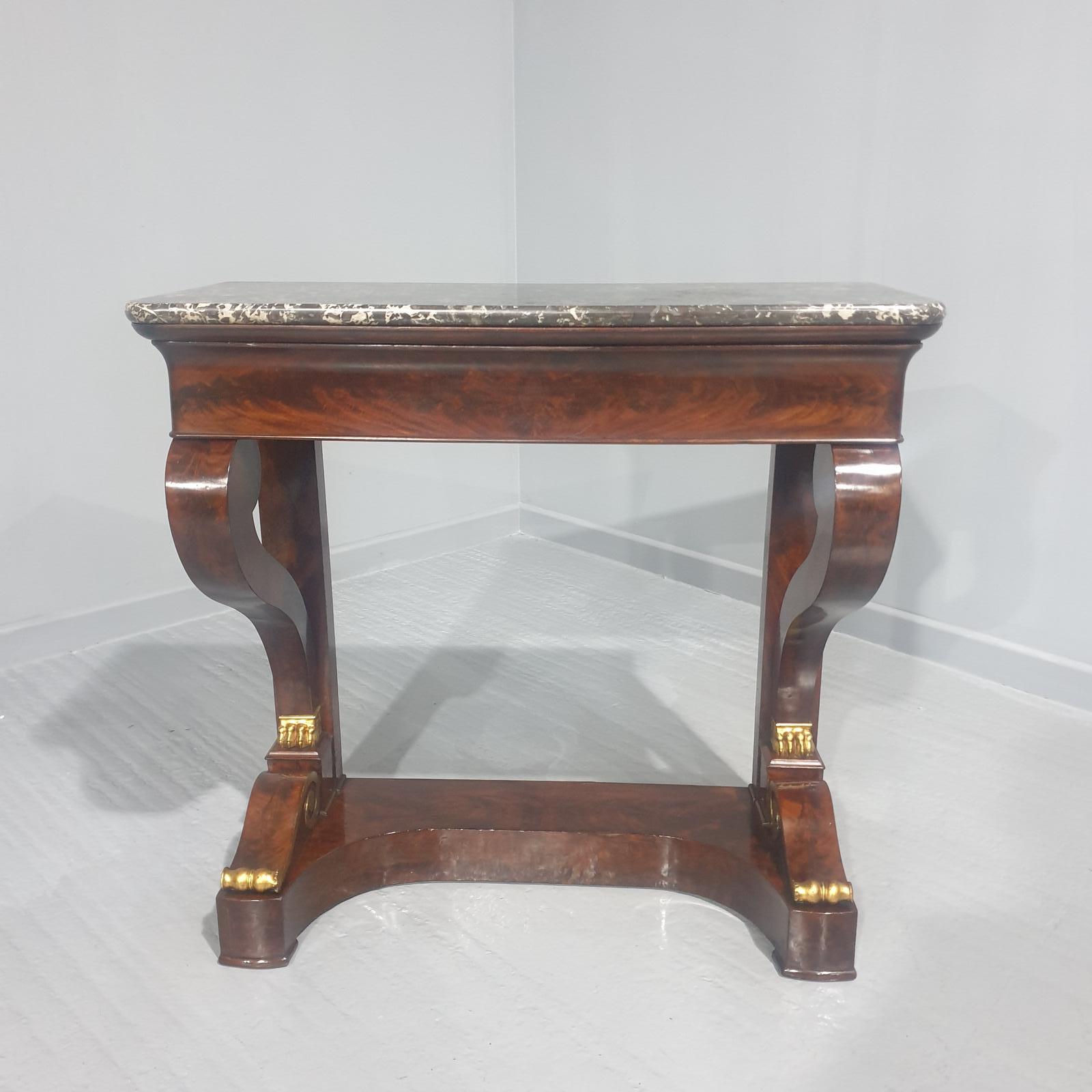 This is a very nice 19th Century French antique flame mahogany and parcel gilt console table with varigated marble top and full width drawer, in overall very good condition.