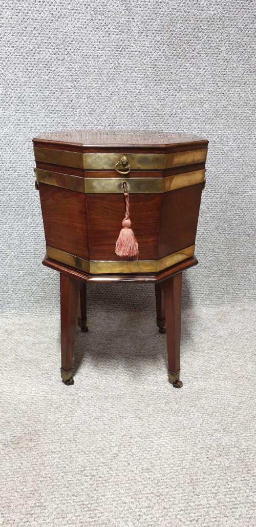 A very nice quality Georgian mahogany wine cooler, brass banded, with original handles, locks, key , brass castors, lead lined, excellent colour and condition.