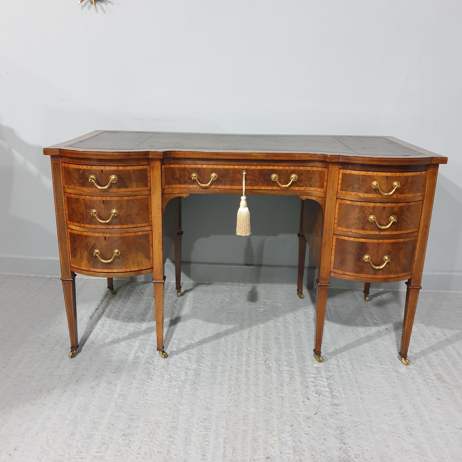 Very good seven drawer freestanding bowed front inlaid mahogany kneehole desk, wonderful gilt handles, original castors and working locks, overall very good colour and condition.