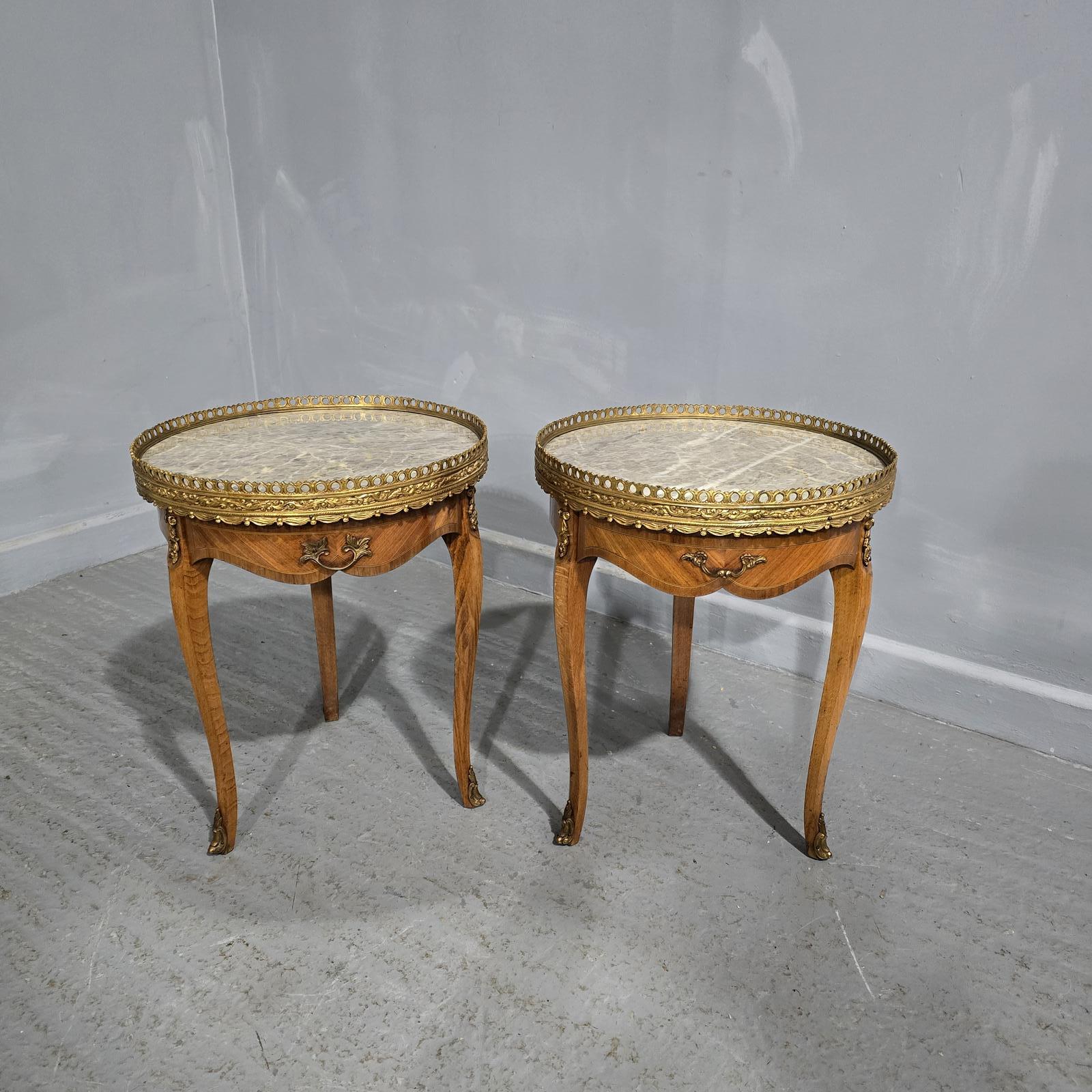 A very good pair of French kingwood inlaid lamp tables with single drawer and stunning marble tops ormolu mounts to rim, handles and toes, in excellent condition.