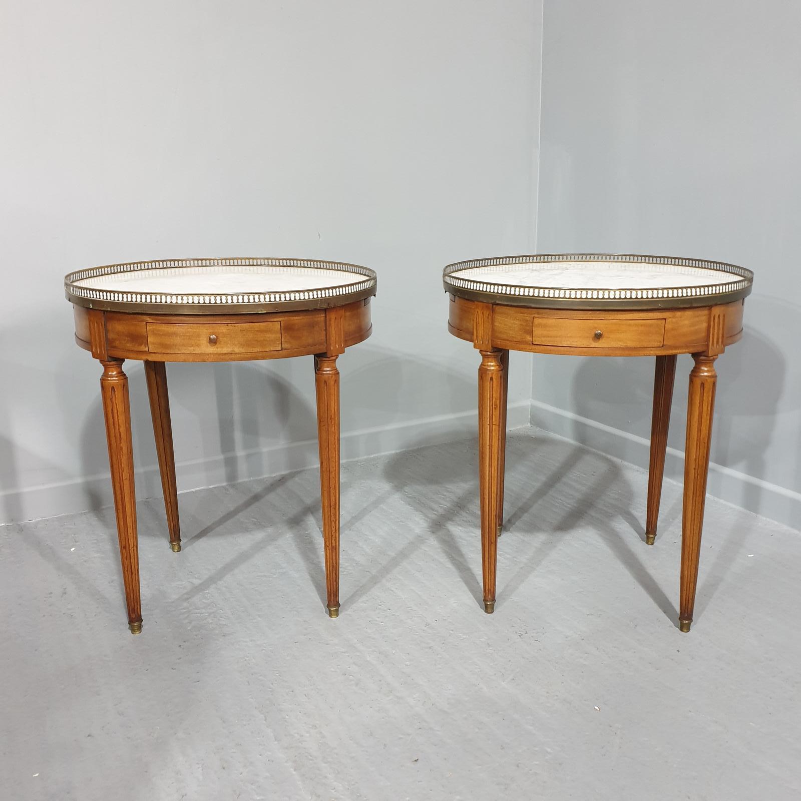 A very good pair of verigated white marble walnut gueridon side tables, each with two drawers and two slides, brass galleries and brass feet, in overall very good original condition having been waxed and cleaned ready for the home.