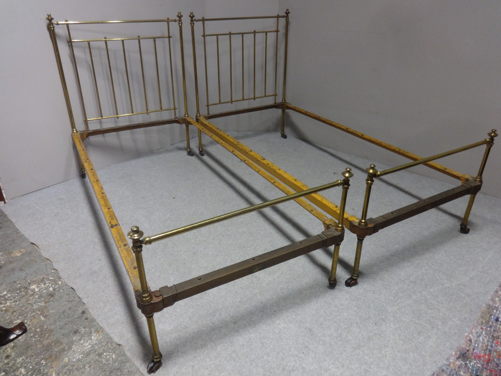 A great pair of single brass beds by 'Heals and Son' each with spring bases and excellent quality mattresses, overall in great original condition