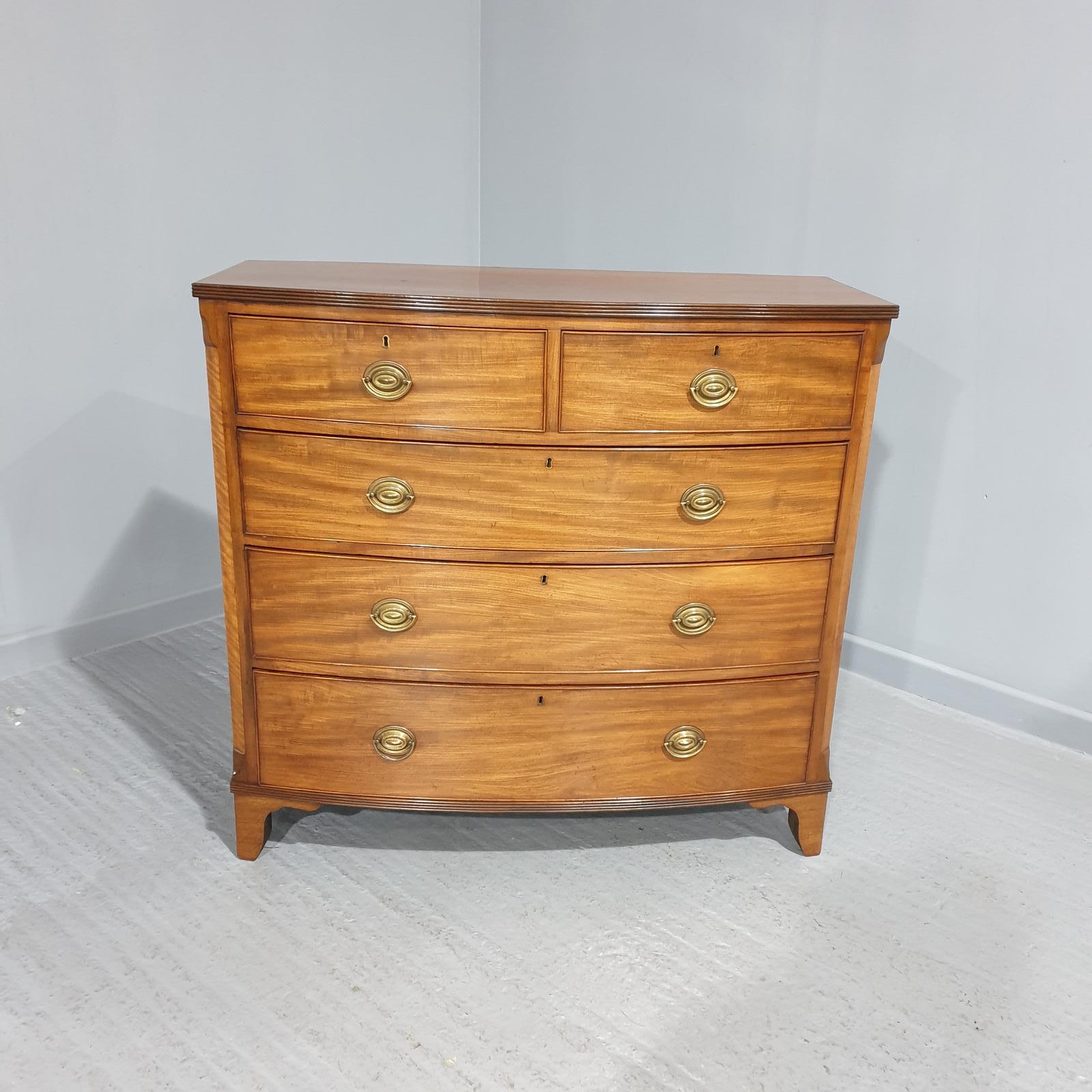 Superior quality five drawer Regency mahogany bow front chest of drawers, in very nice original condition and standing on bracket feet.