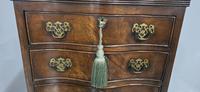 A super deep serpentine flame mahogany tall chest of six drawers, oak lined with brass handles and standing on outswept bracket feet, excellent colour and overall condition.