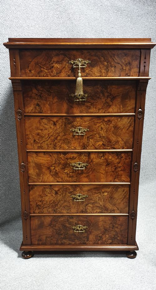 A very good quality Victorian burr walnut seven drawer chest of drawers on bun feet, gilt brass handles and original locks, solid pine drawer linings. excellent colour and condition.