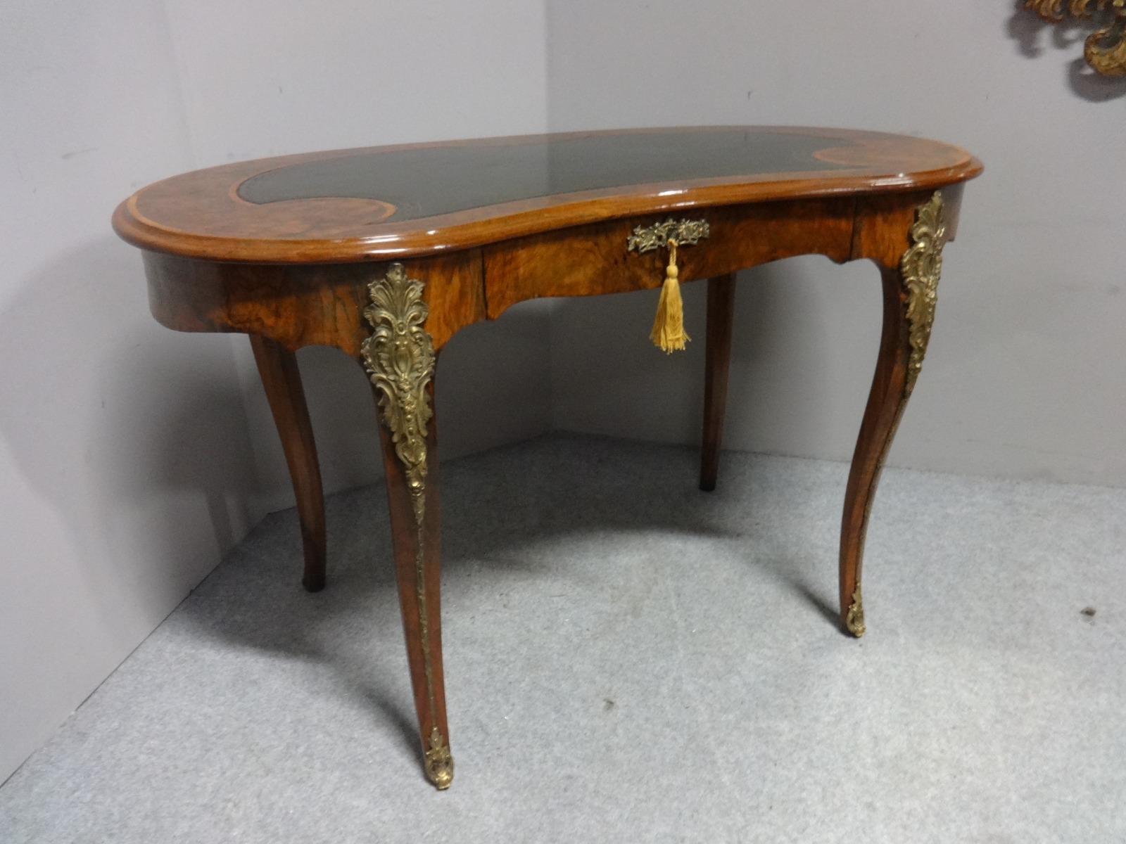 A very good freestanding 19th Century Victorian antique burr walnut kidney shaped desk with ormolu mounts, single drawer with key, dark green leather, in excellent condition.