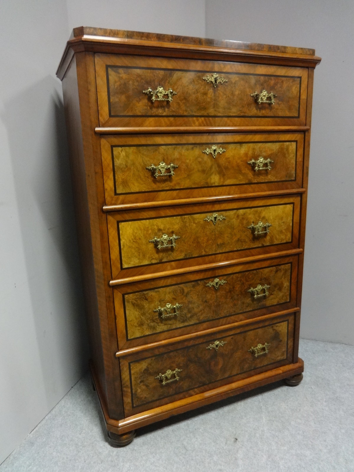 This is an excellent quality 19th Century antique burr walnut five drawer tall chest of drawers, superb gilt handles, ebony inlays, in excellent condition.