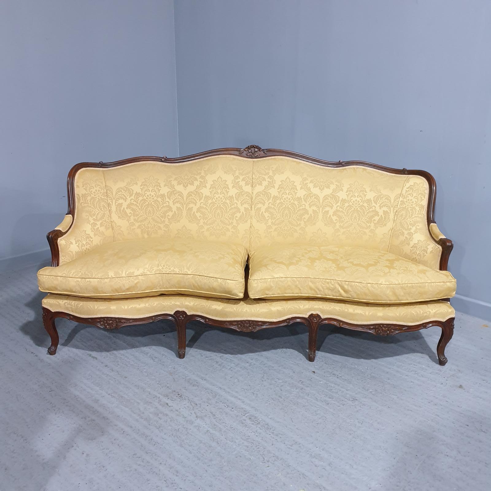 This is a wonderful French curved and serpentine front walnut sofa with feather filled cushions, in superb original condition covered in gold damask.