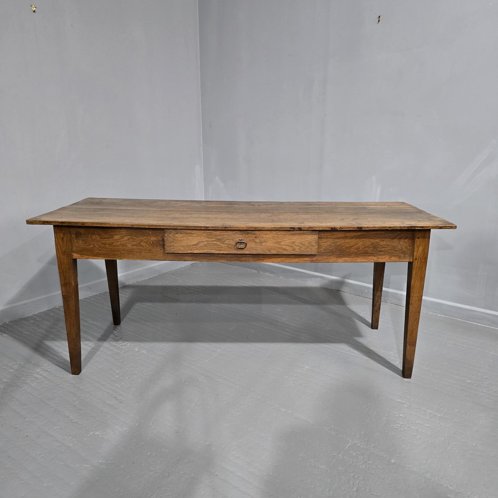 Excellent quality French four plank farmhouse dining table with central side drawer, lovely colour and condition.