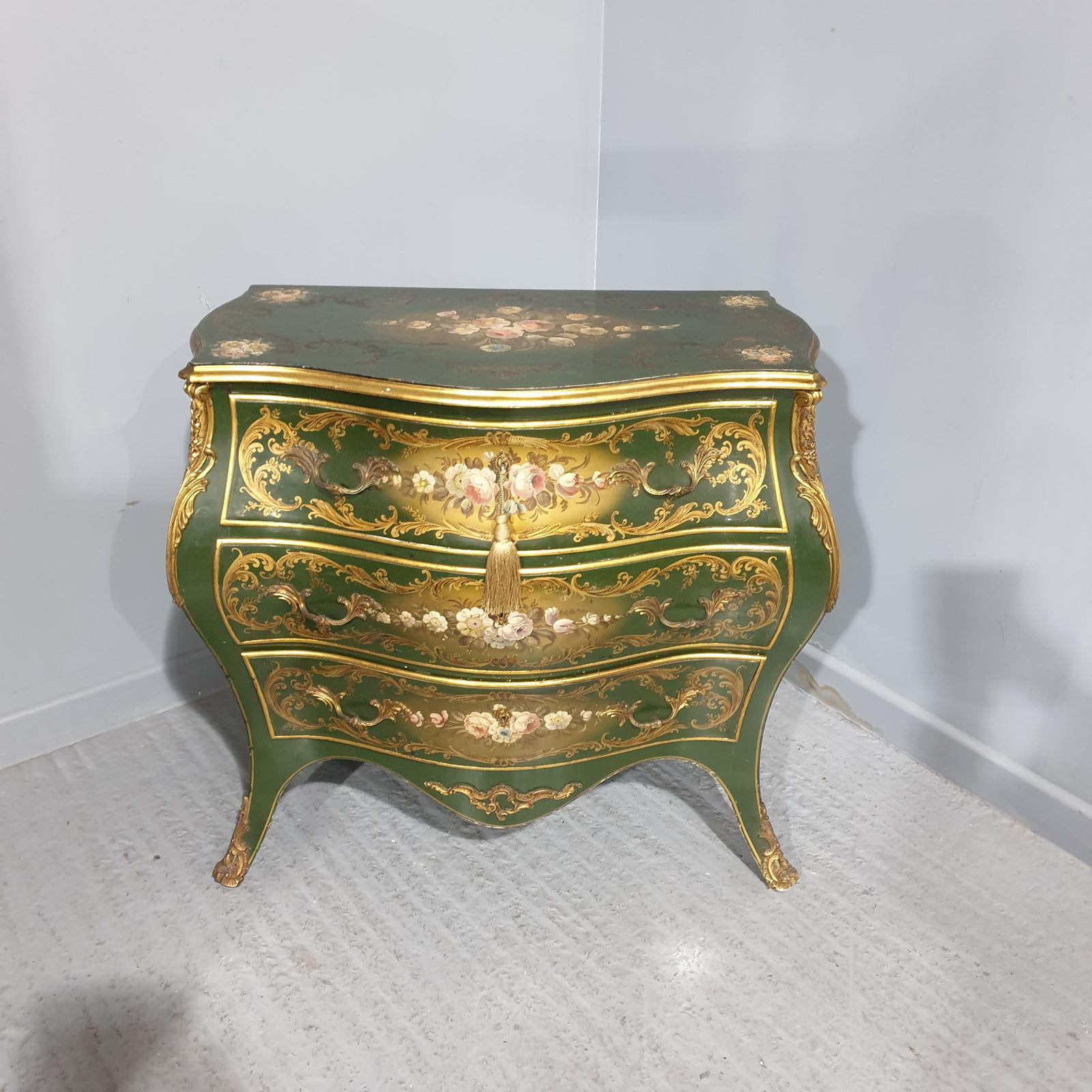This is an outstanding French antique bombe shaped three drawer painted chest of drawers with raised and handpainted decoration, gilt brass mounts and handles, in overall very good condition.