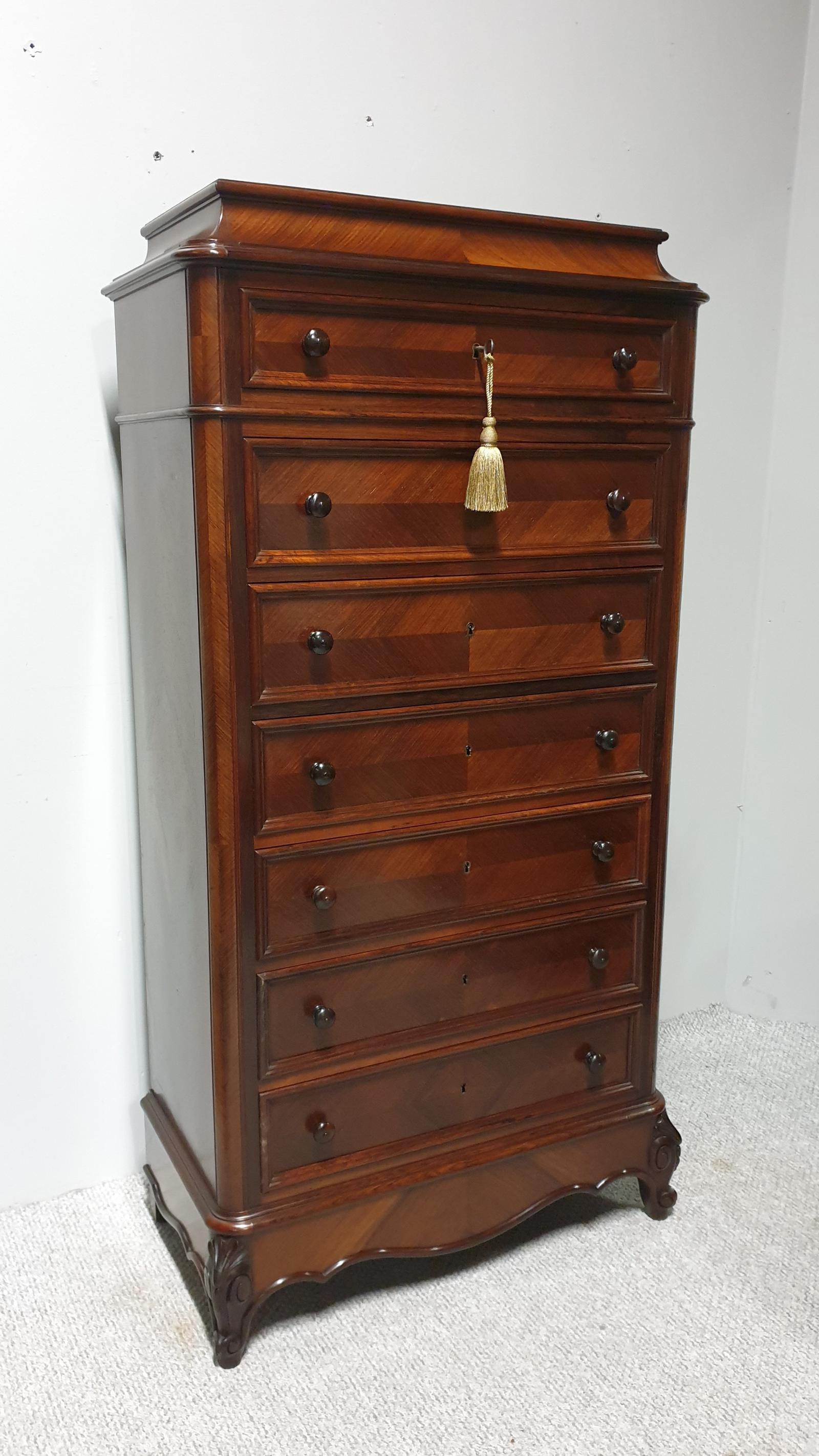 This is a wonderful French rosewood seven drawer semanier chest of drawers in excellent original condition throughout, oak lined with original rosewood knobs, original working key.