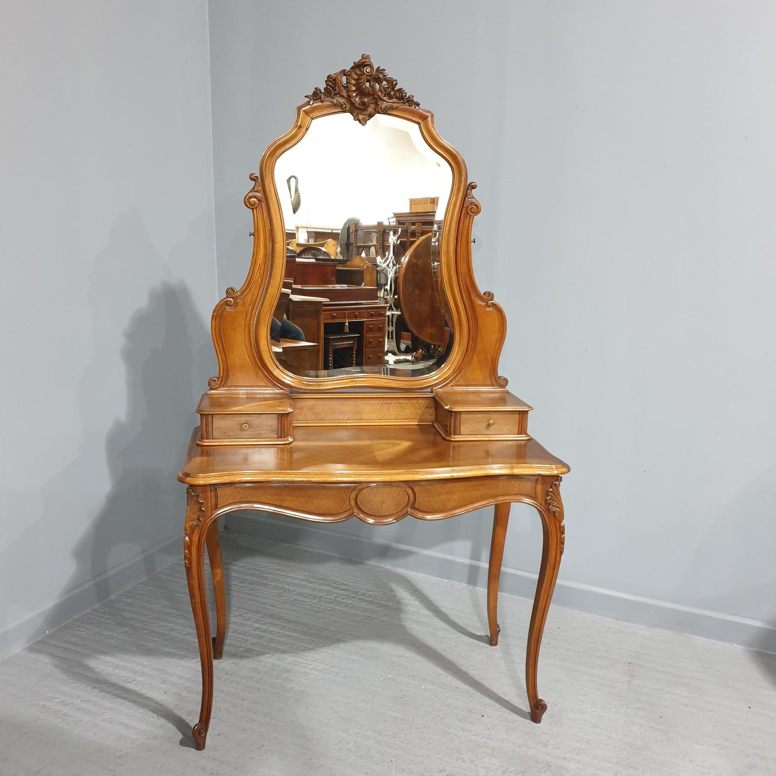 This is a lovely quality late 19th Century French antique walnut dressing table with full width drawer and huge bevelled swinging mirror, two small drawers.