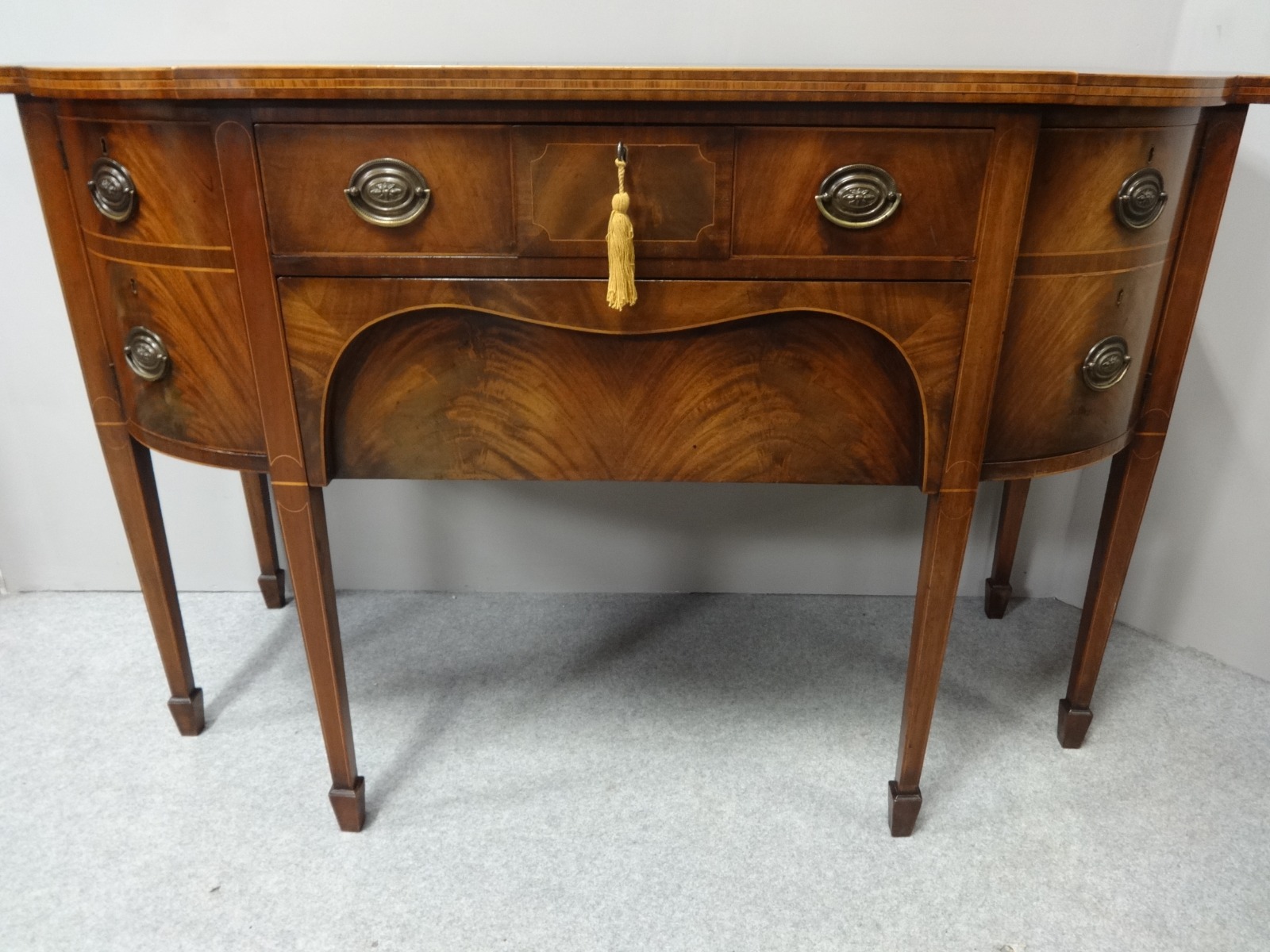 Excellent quality George 3rd mahogany inlaid sideboard, of bowfront shape, original brass handles and working locks, excellent colour and condition.