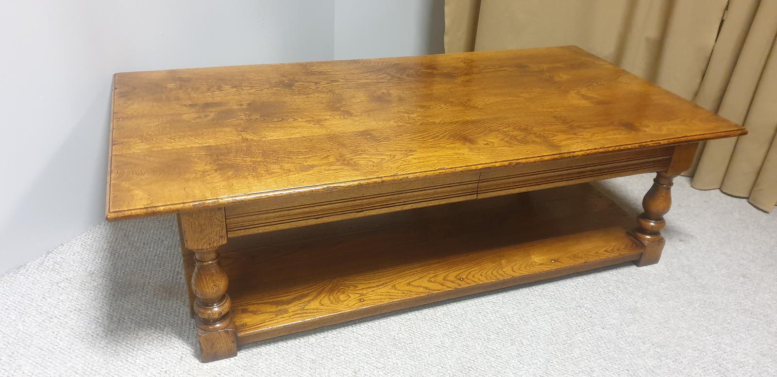 This is a large golden oak three plank oak coffee table on turned legs with plank undertier and two drawers, excellent colour and condition.
