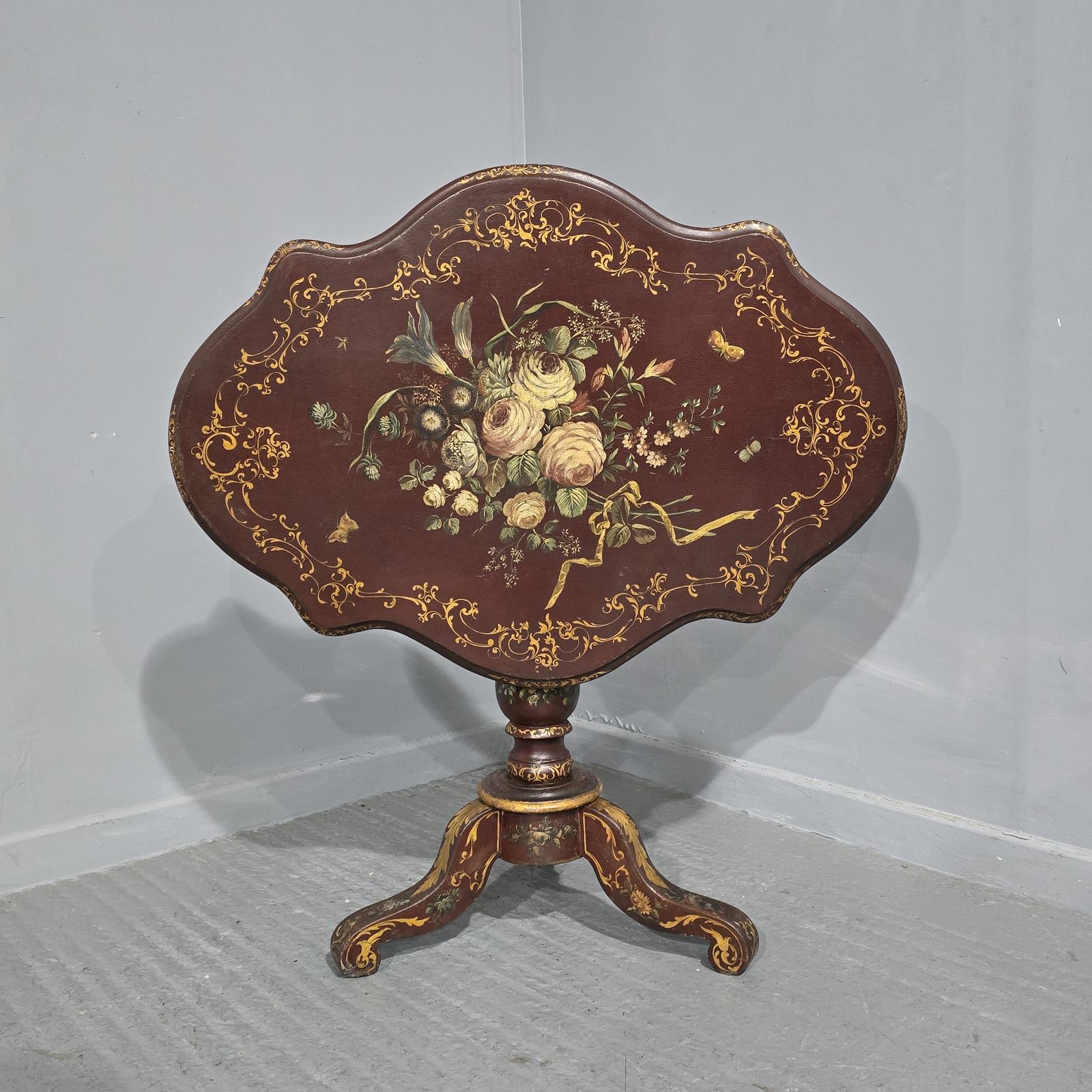 A very nice North Italian painted pedested tilt top table, deep red base with floral decoration, in excellent near original condition.