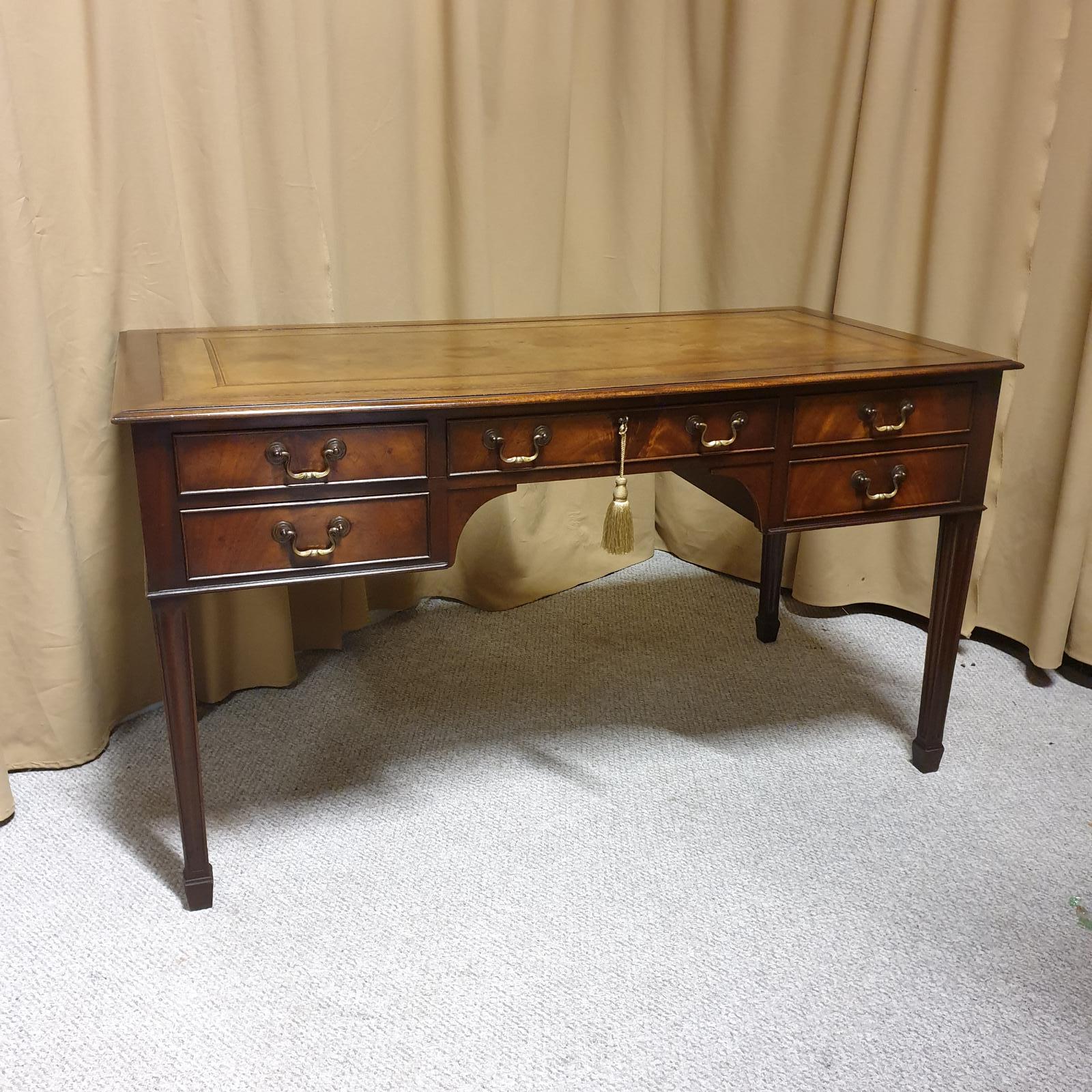 A very good flame mahogany freestanding writing table with hand cut dovetail drawers, brass handles, original tan leather.