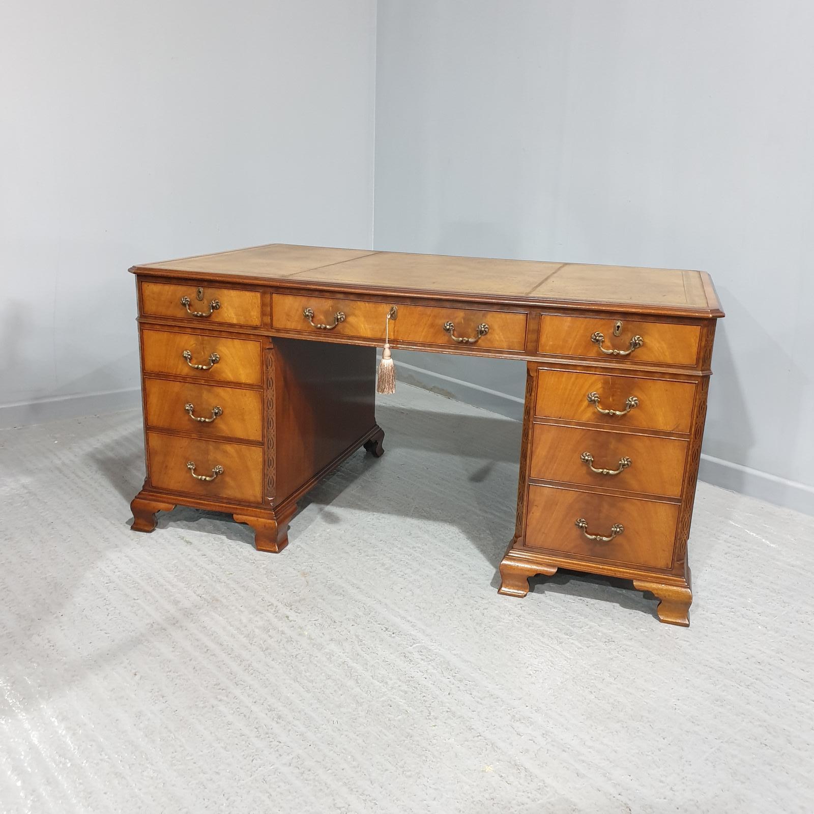 This is a wonderful nine drawer mahogany pedestal desk with cupboards to the rear, tan leather, brass handles, in excellent overall condition.