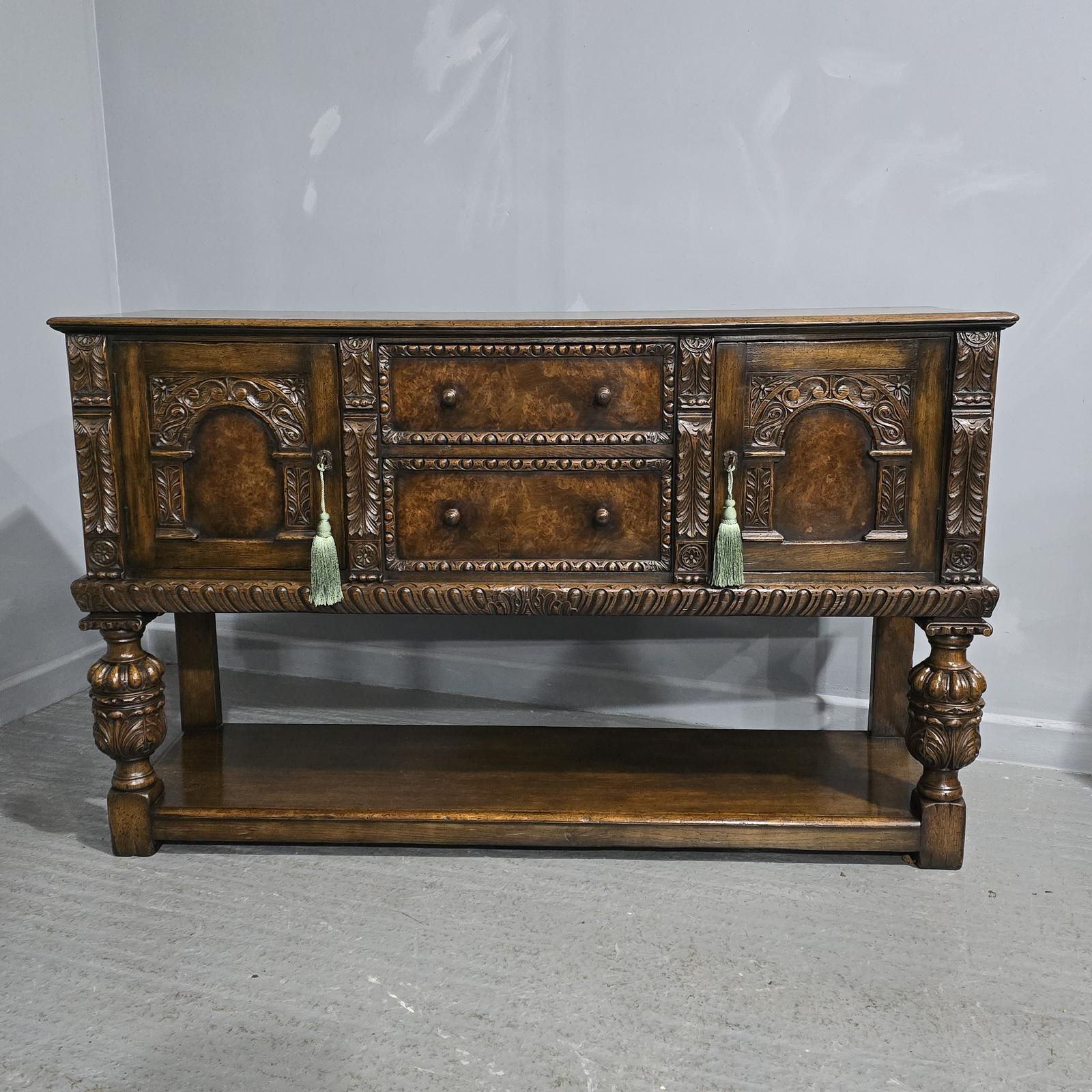 Outstanding Elizabethan style oak and burr walnut sideboard, with bulbous legs, oak plank underHier. double doors with two central drawers, in excellent home ready condition.