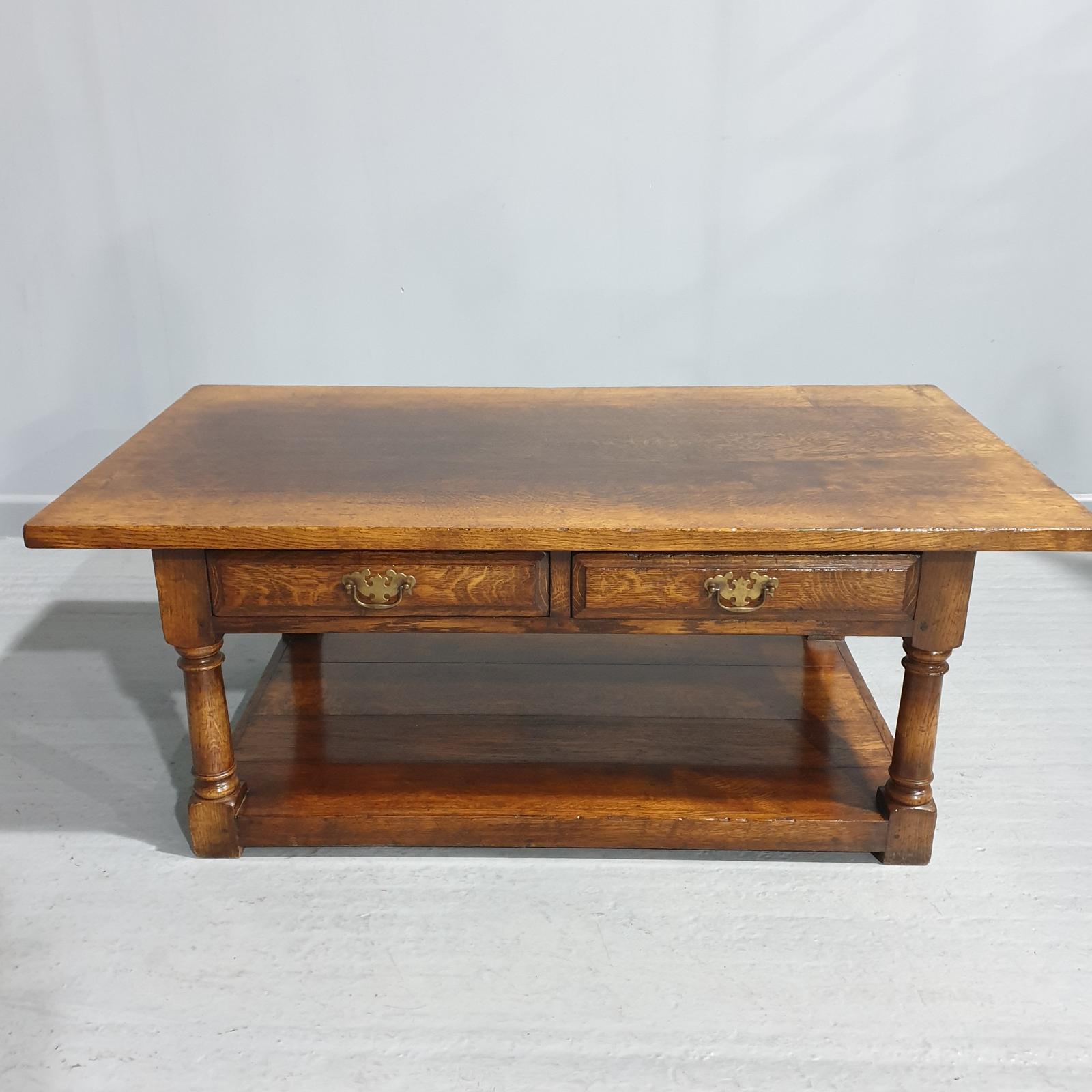 Excellent quality oak plank coffee table by Tichmarch and Goodwin of Ipswich, peg jointed throughout, plank top and undertier, two drawers with brass handles.