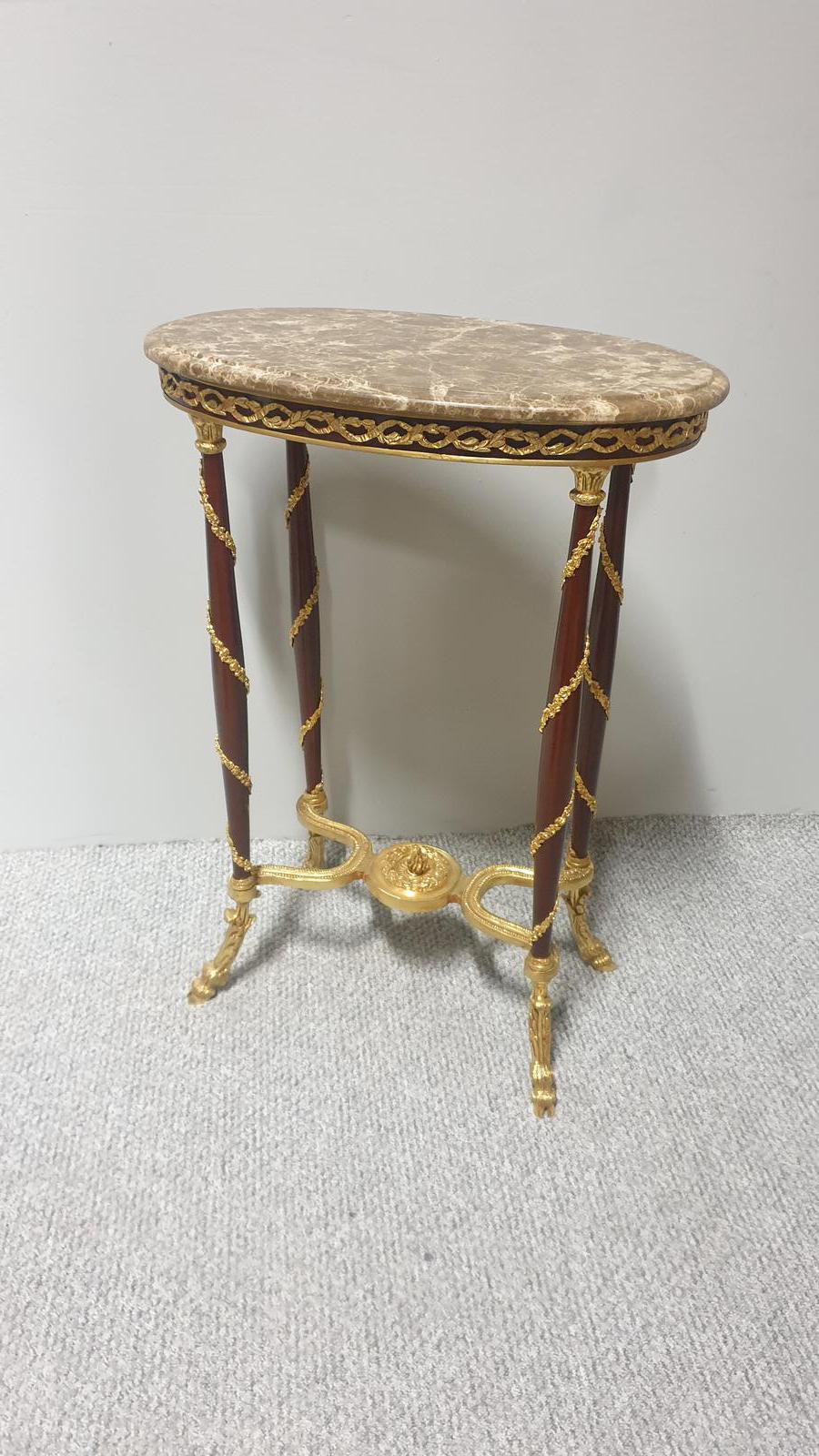 Outstanding French mahogany occasional lamp table in the 'Linke style', with variegated marble top, ormolu under tier, ormolu twists and corinthian tops, and stunning goats feet. excellent colour and condition.