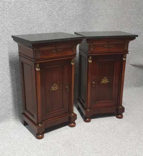A wonderful pair of French Empire mahogany cabinets with drawers, left and right openings, gilt bronze mounts, black slate tops and standing on bun feet, excellent colour and condition.