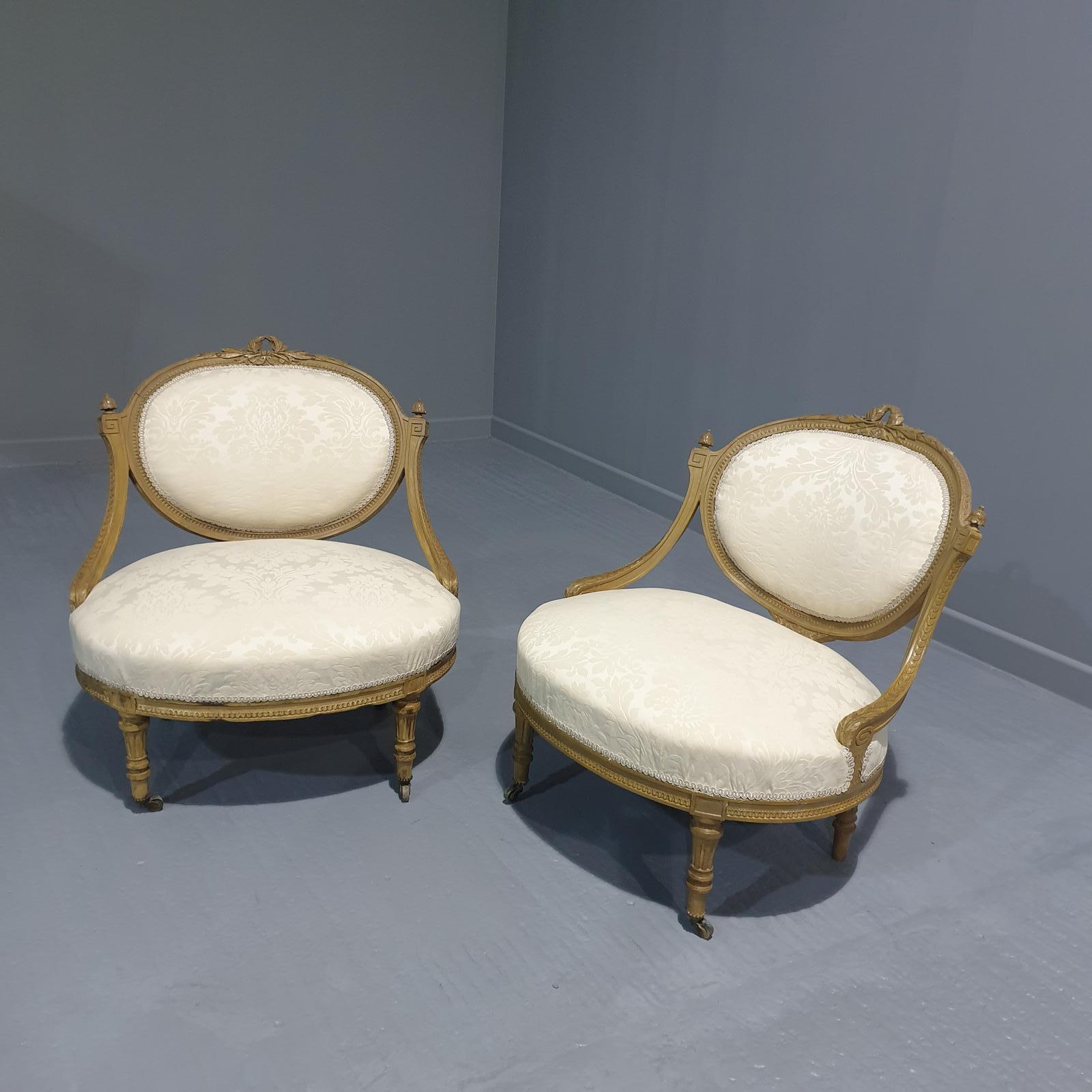 These are a wonderful pair of 19th Century French antique painted tub chairs, in excellent condition, recently reupholstered in cream, original castors, no signs of worm or damage.
