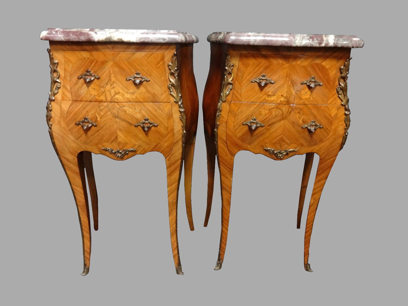 These are an excellent quality pair of French tulipwood bedside/lamp two drawers chests, with marquetry panels, quality ormolu embellishments, top quality marble tops, in excellent original condition.