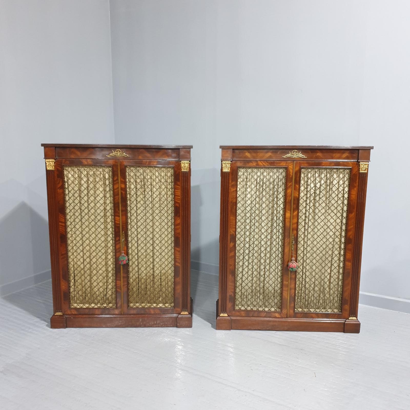 Top quality pair solid mahogany 'Regency style' bookcases or side cabinets, with crossbanded tops, flame mahogany fronts, brass grill fronts with original silk fabric, brass mounts and adjustable shelving, in very good original condition, made by 'G T Ratcliffe'.