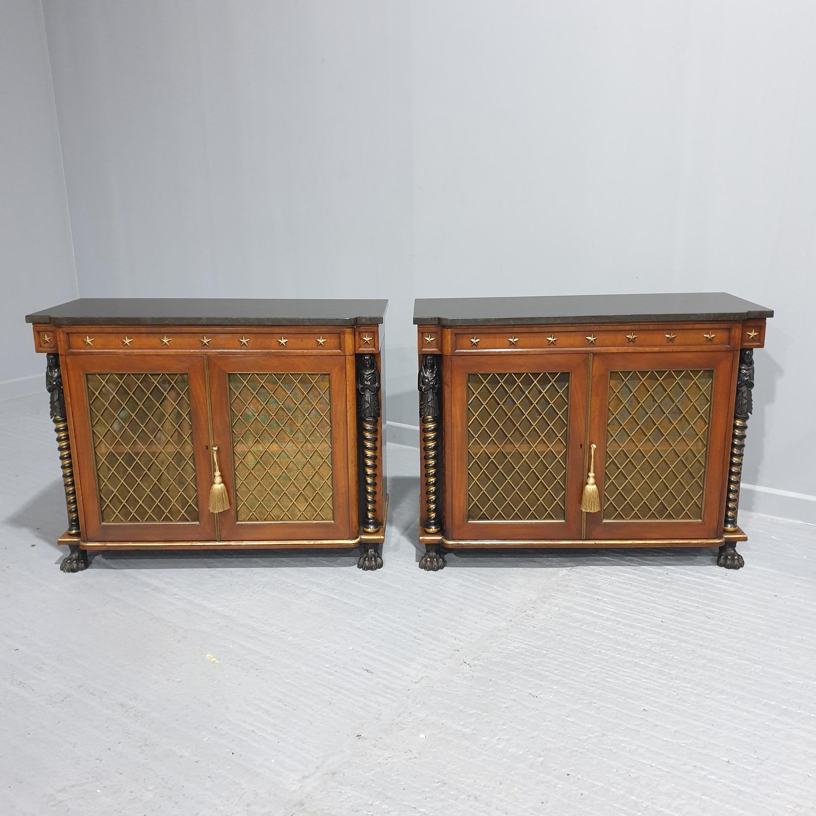 A top quality pair of Regency style mahogany cabinets, with brass and mesh grill doors, black slate tops, double doors open to reveal single shelf, ebonised and gilded figures to the sides and standing on black paw feet, working locks, in excellent original condition.