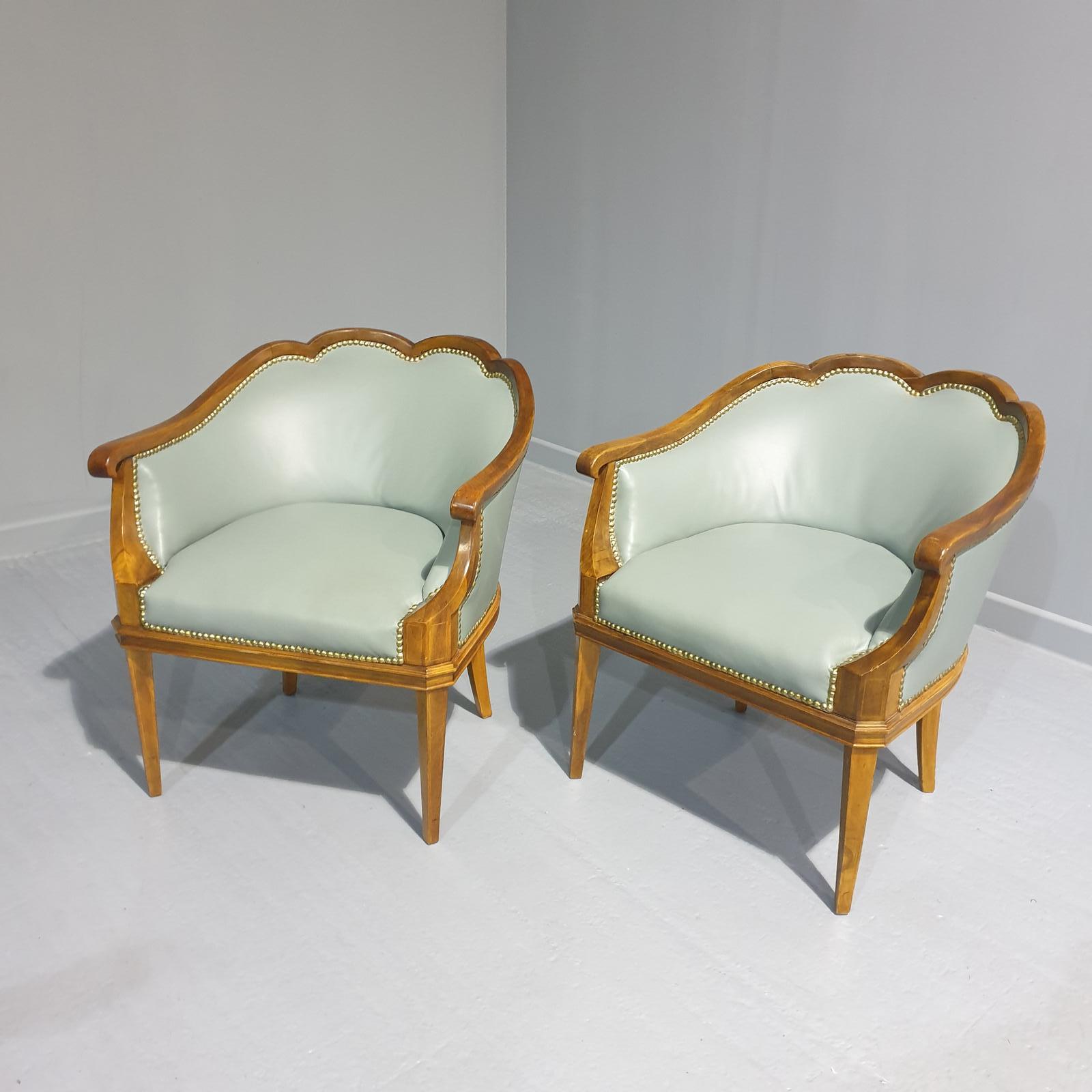 These are a very good pair of antique solid walnut cloud backed Swedish tub armchairs covered in grey/blue leather, excellent colour and condition.