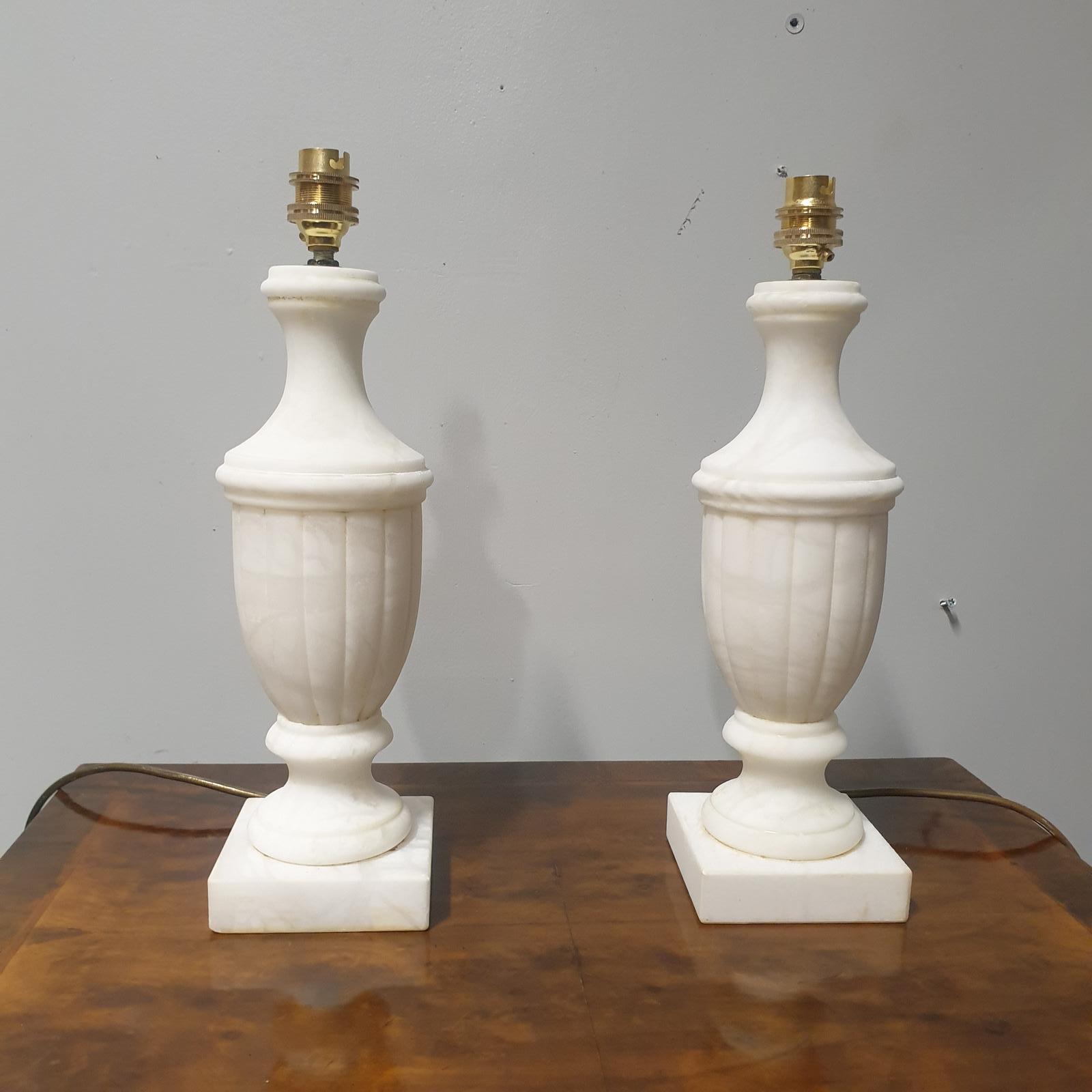 These are a very good pair of early 20th Century antique urn shaped white marble table lamps, in excellent condition rewired and ready for use.