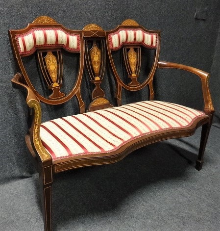 A good double serpentine window seat, inlaid with boxwood urns and foliage, mahogany and rosewood. It has outswept arms and stands on spade feet.