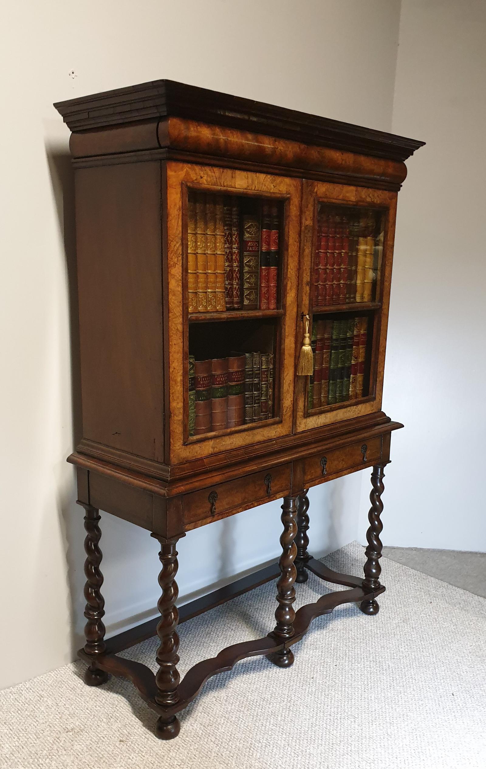 A very good Queen Anne style burr walnut bookcase on stand, with top cushion and sitting on a two drawer barley twist base with shaped under tier, end grain mouldings, in excellent original condition.