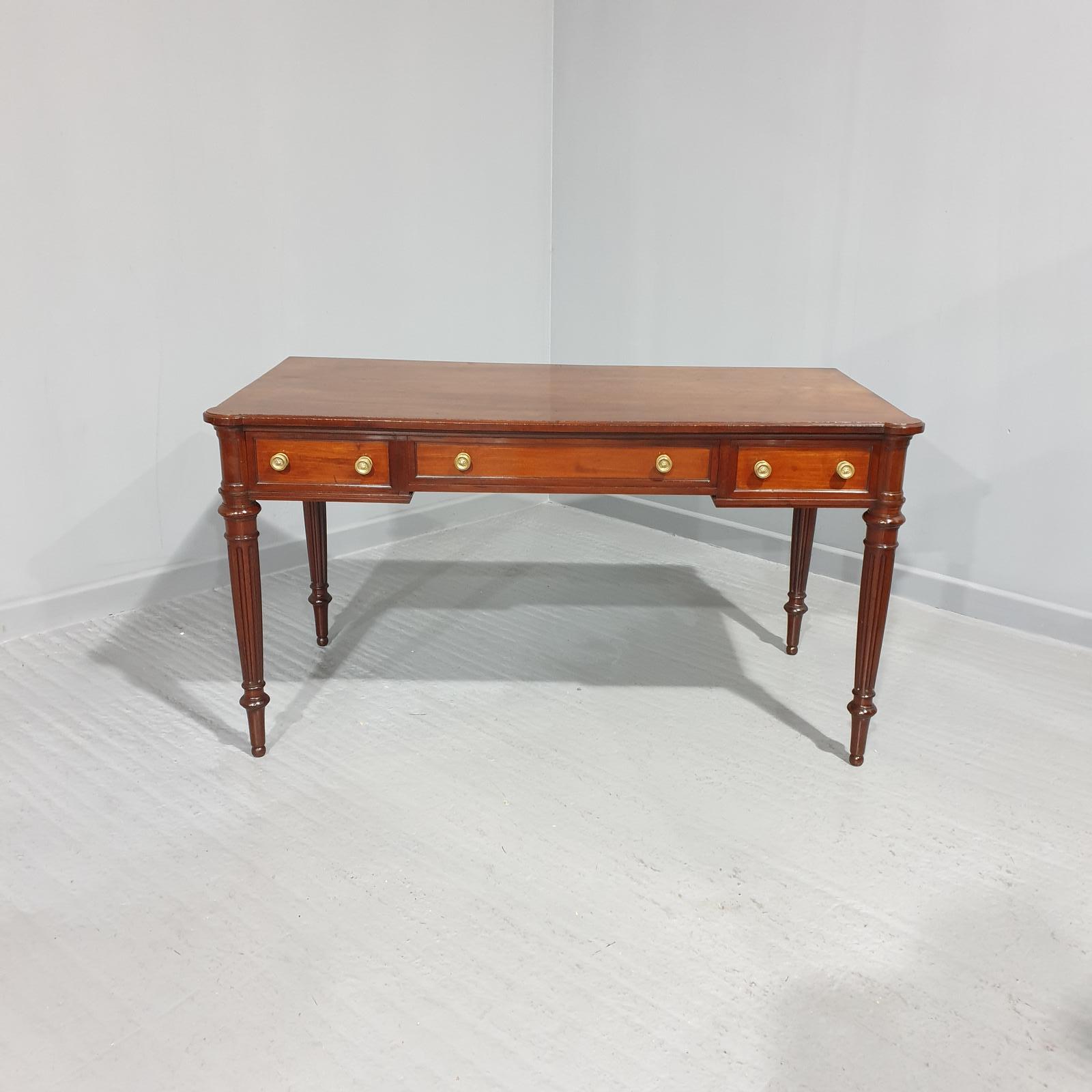 A top quality Regency style three drawer library writing table, brass lion handles, reeded legs, solid mahogany, fine hand cut dovetail joints, excellent colour and condition.