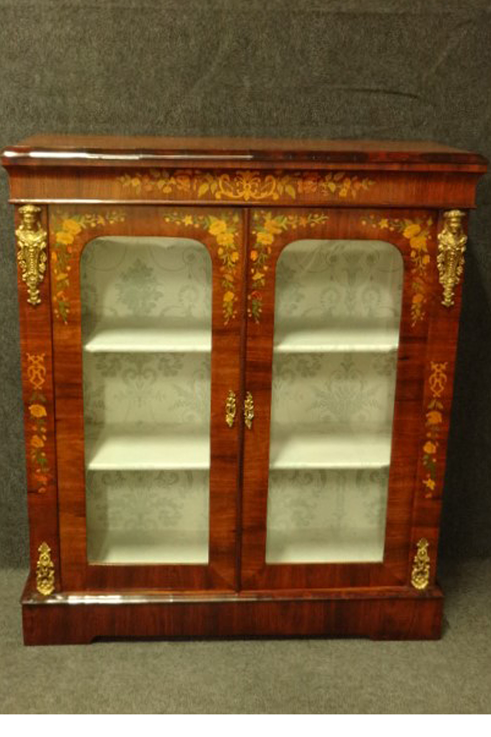This is a very good rosewood two door side cabinet, bookcase with marquetry flowers around the arched top doors and outswept plinth. It has excellent quality ormolu mounts and has been fully repolished to a very high standard and relined.