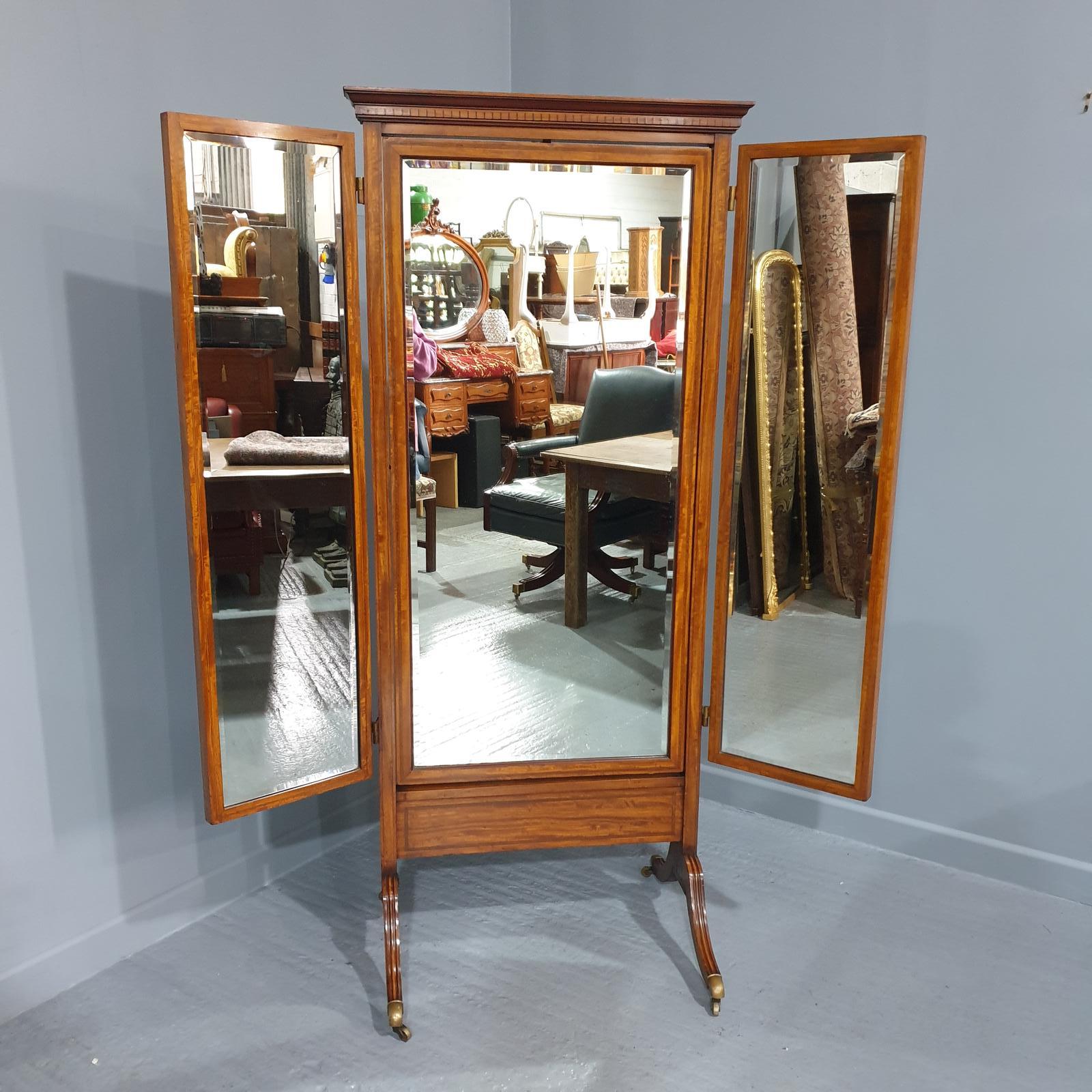 This is a rare inlaid satinwood tryptic cheval mirror which closes on itself, mirror plates are in super condition, overall excellent condition having been cleaned and waxed ready for the home.