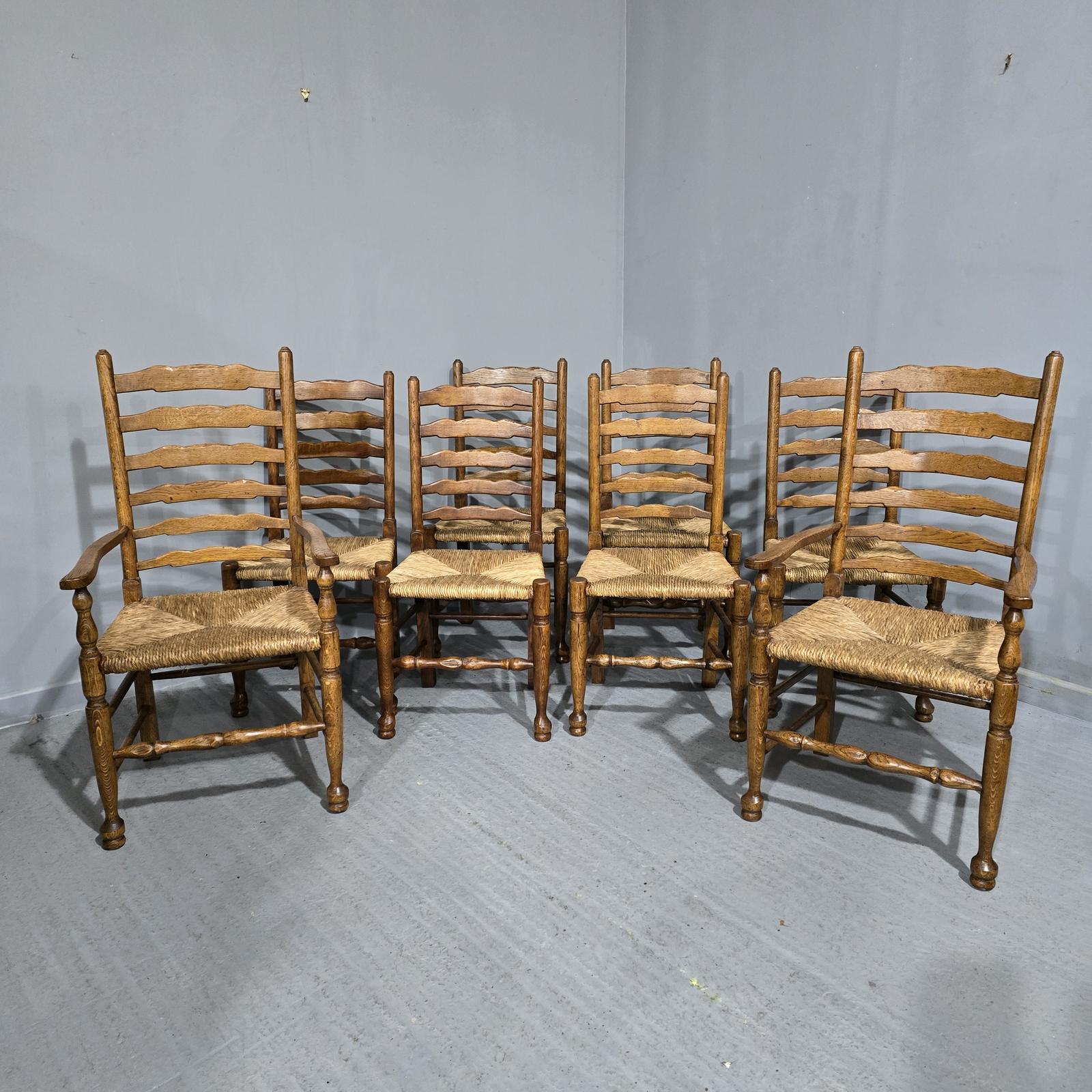 A superb set of eight (6 chairs, 2 carvers) rush seated ladder backed chairs in light oak, in overall very good condition.