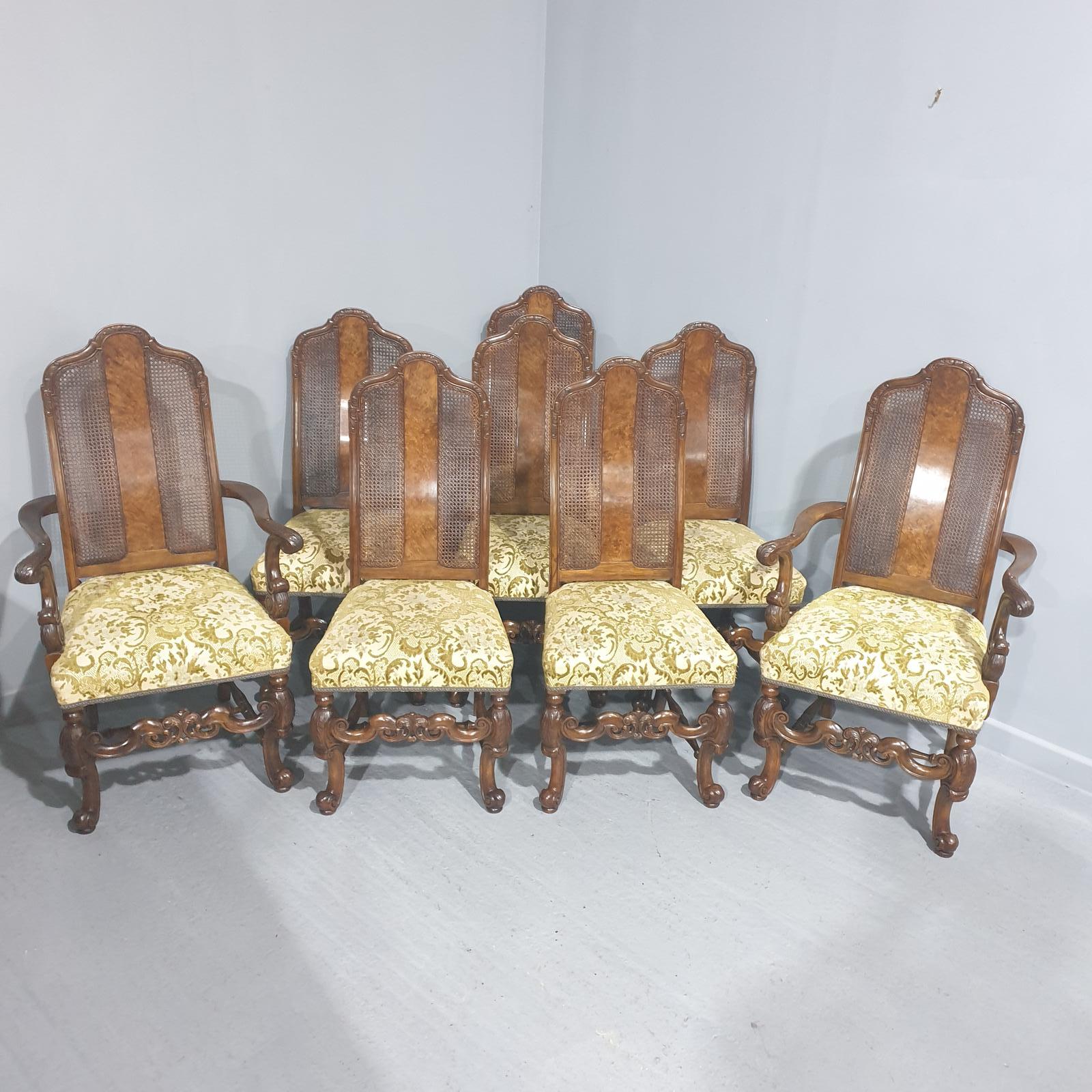 Outstanding set of eight (six + two) walnut and bergere Queen Anne style dining chairs, in original condition with a superb colour. excellent condition.