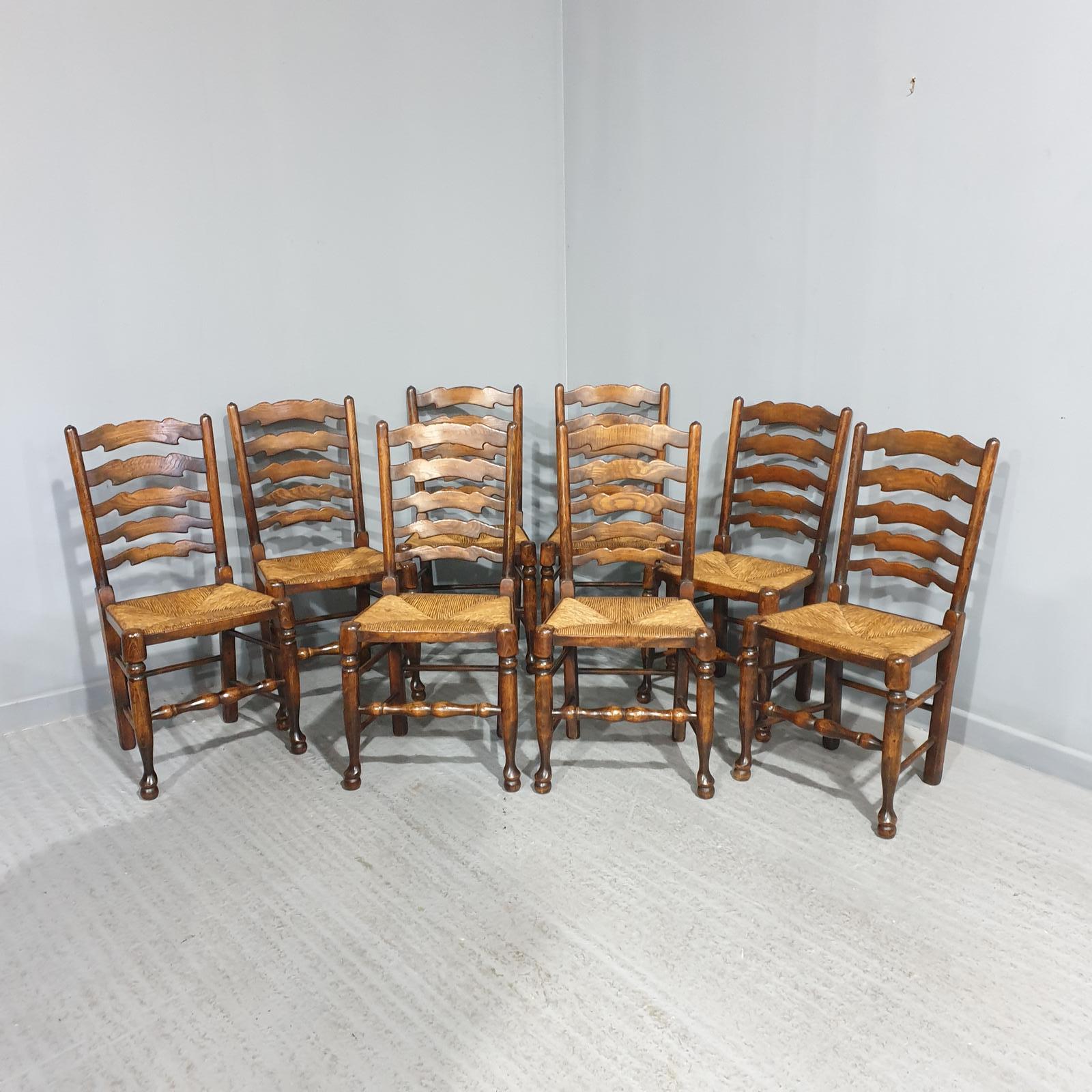 These are a wonderful set of eight antique dining chairs oak and ash with original rush seats, excellent colour and condition.