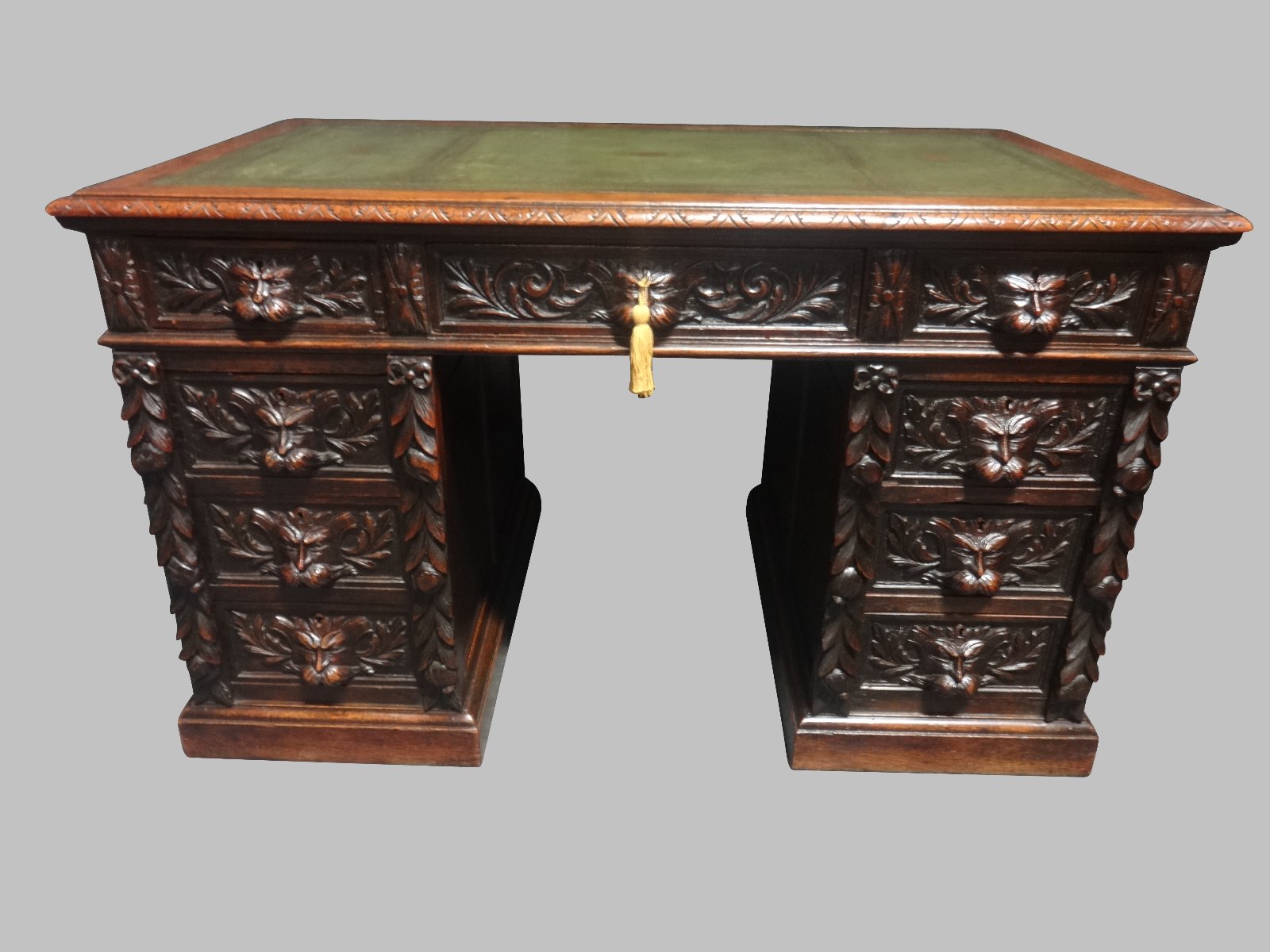 This is an excellent quality nine drawer solid oak green man panelled pedestal desk, original locks and key, good colour with green leather top, in excellent condition.