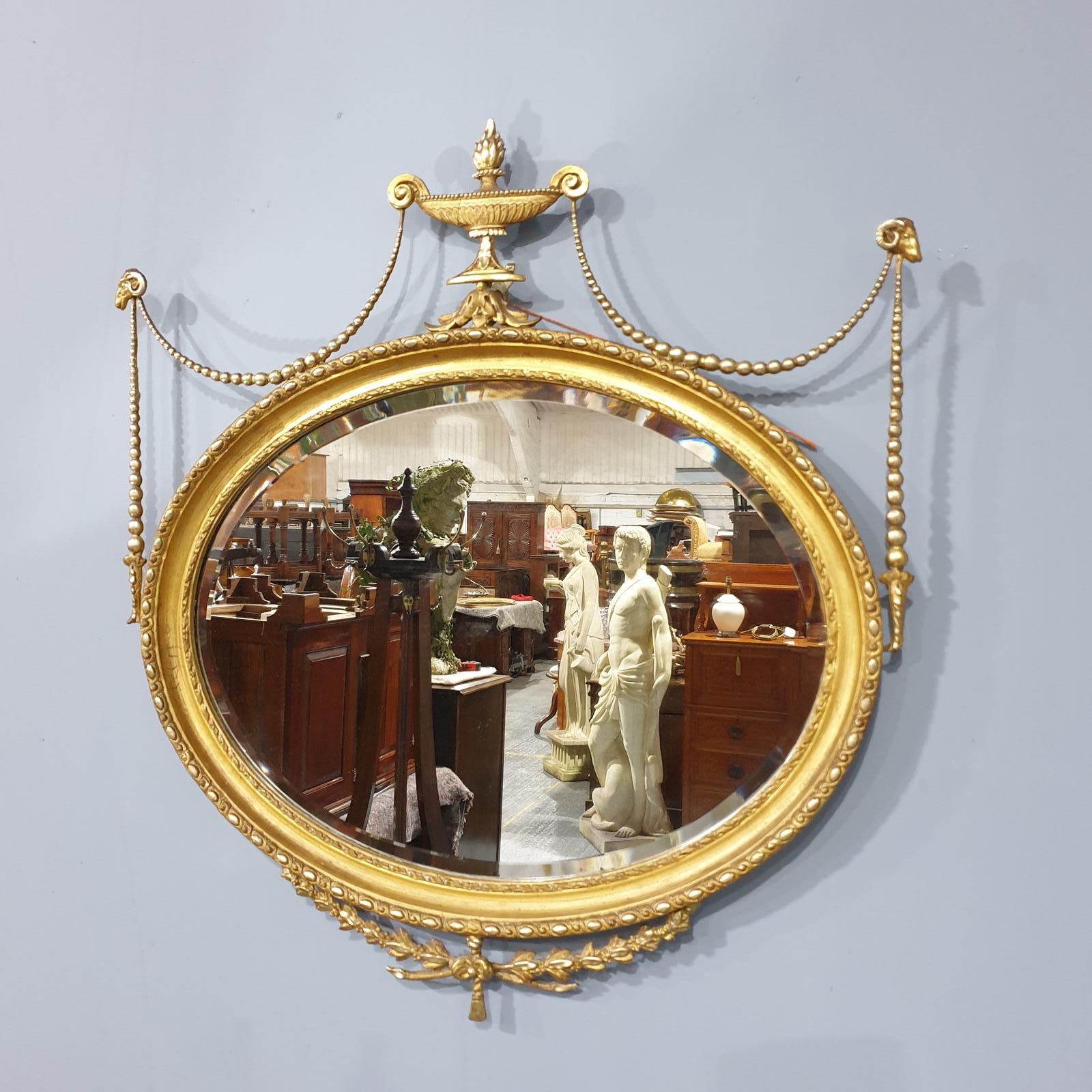 This is a super quality Adam style Victorian gilt oval wall mirror, with ball swags with rams head and topped with an urn, bevelled mirror, in lovely original condition.