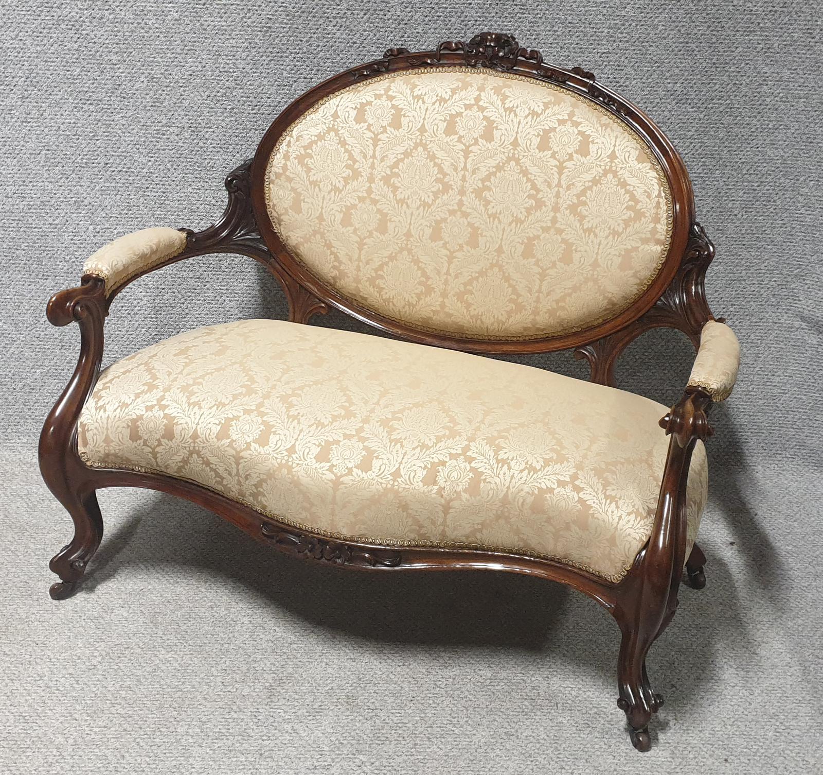 A excellent quality Victorian mahogany sofa/couch, with recently upholstered gold damask fabric, brown porcelain castors, excellent colour and condition.