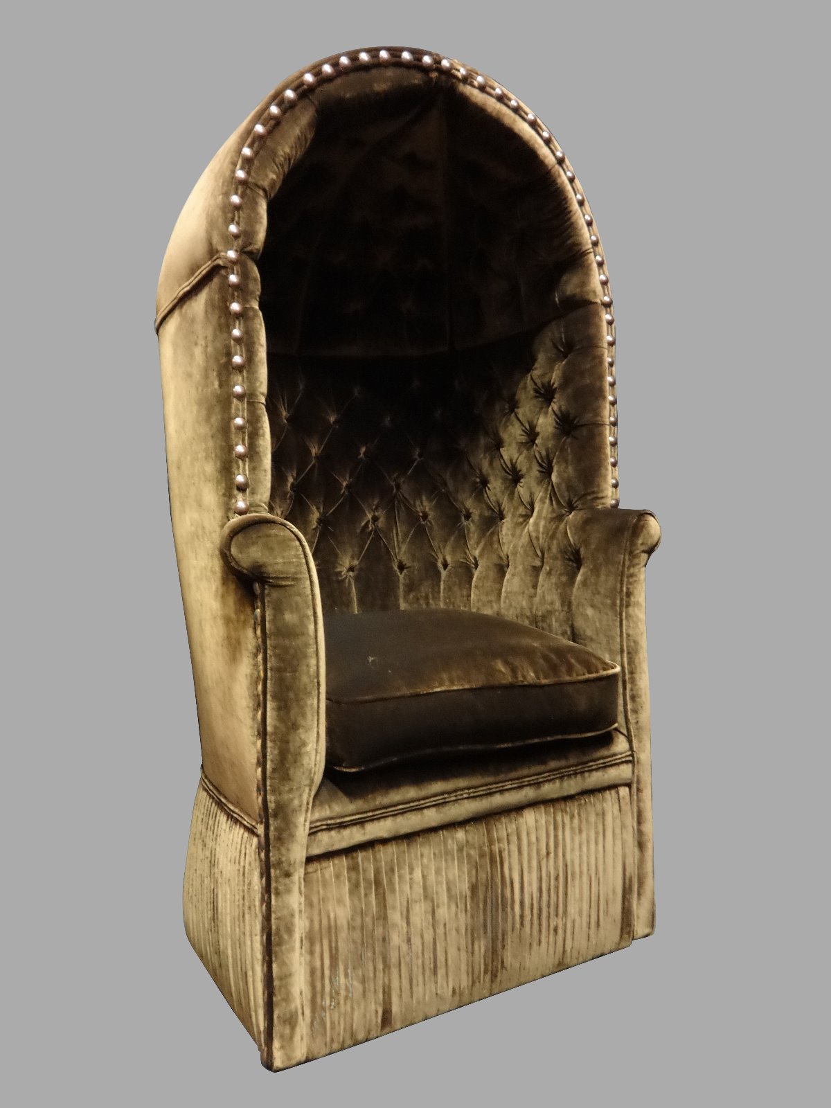 This is an excellent quality Victorian porters chair, deep buttoned velvet plush to the inside, pleated to the base, brass studded and double piped to the edges, opening space to the front bottom and a separate cushion, standing on brass castors, in excellent original condition.