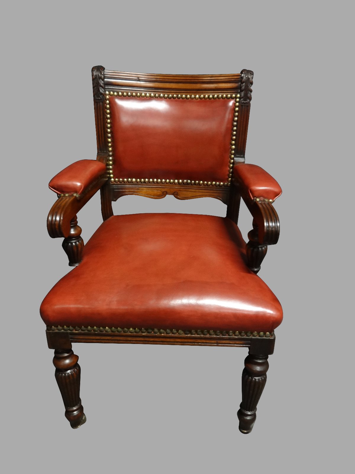 This is a very good Victorian antique walnut desk chair with original pot castors, covered in red hide with individual brass studs, in excellent condition.