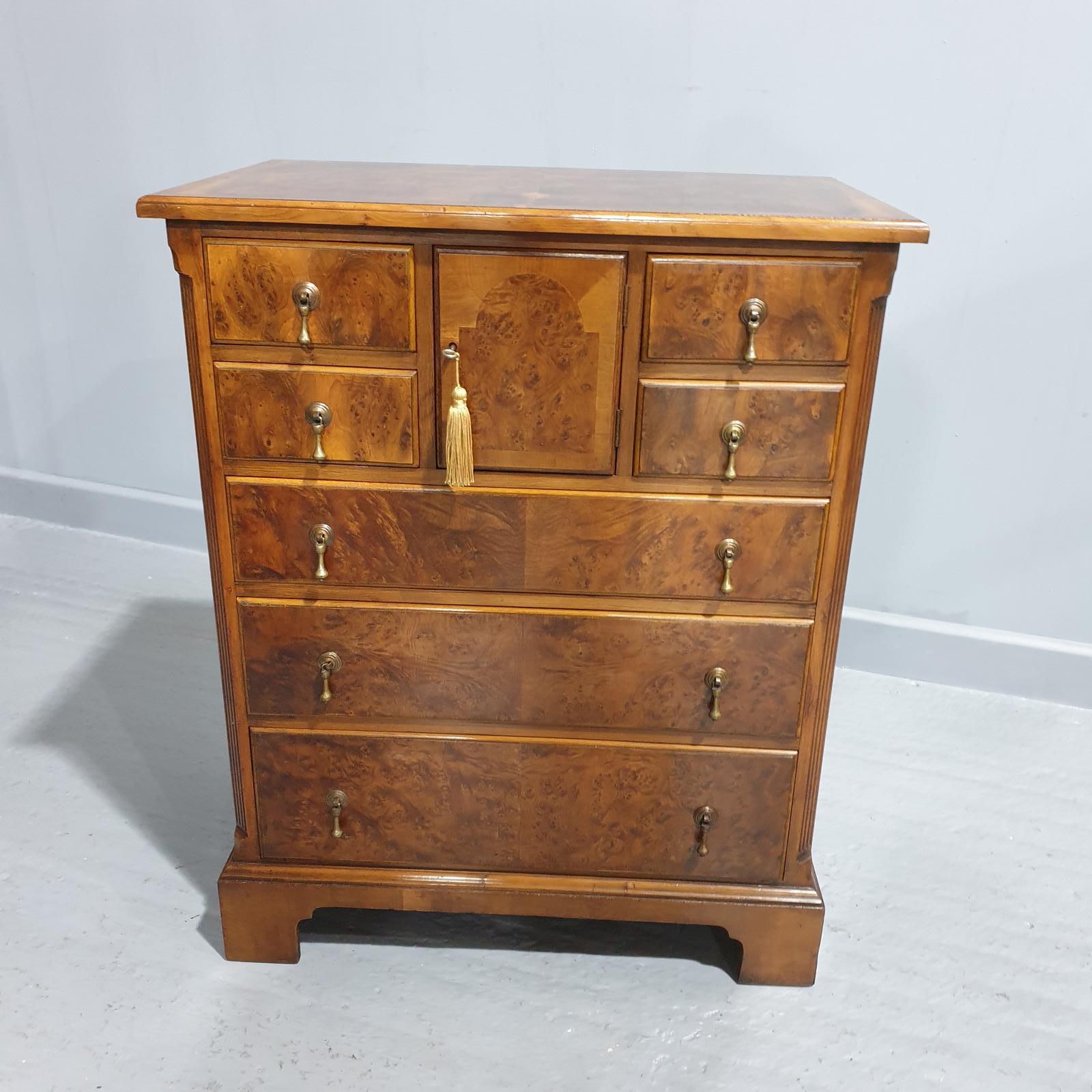 A very good quality seven drawer yew wood chest of drawers with cupboard to the centre, mandril oak lined throughout, brass handles, in overall excellent condition.