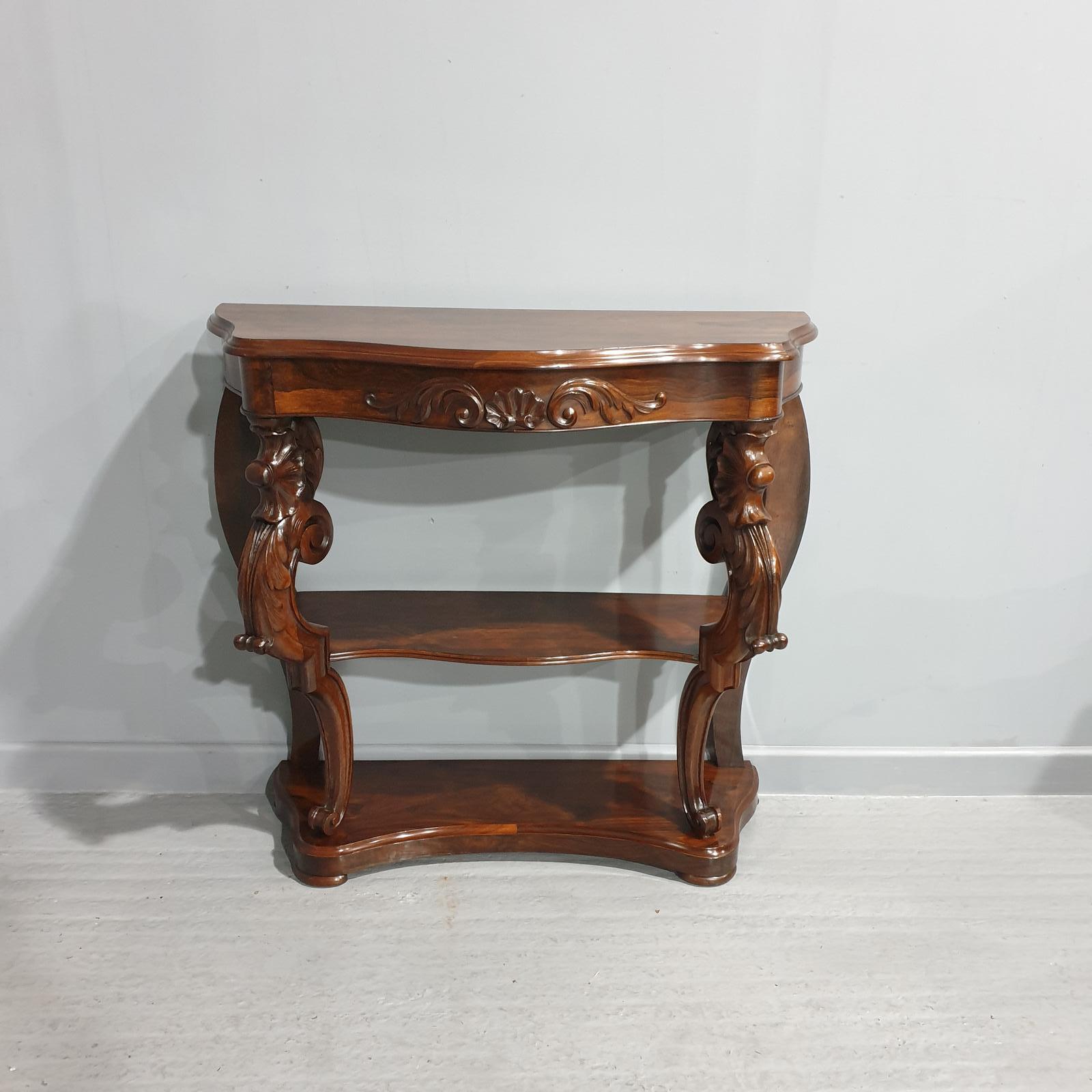 Top quality 19th Century English antique rosewood serpentine fronted console table, full width drawer with carved detailing, crisp carved front legs, three tier, excellent colour and condition.