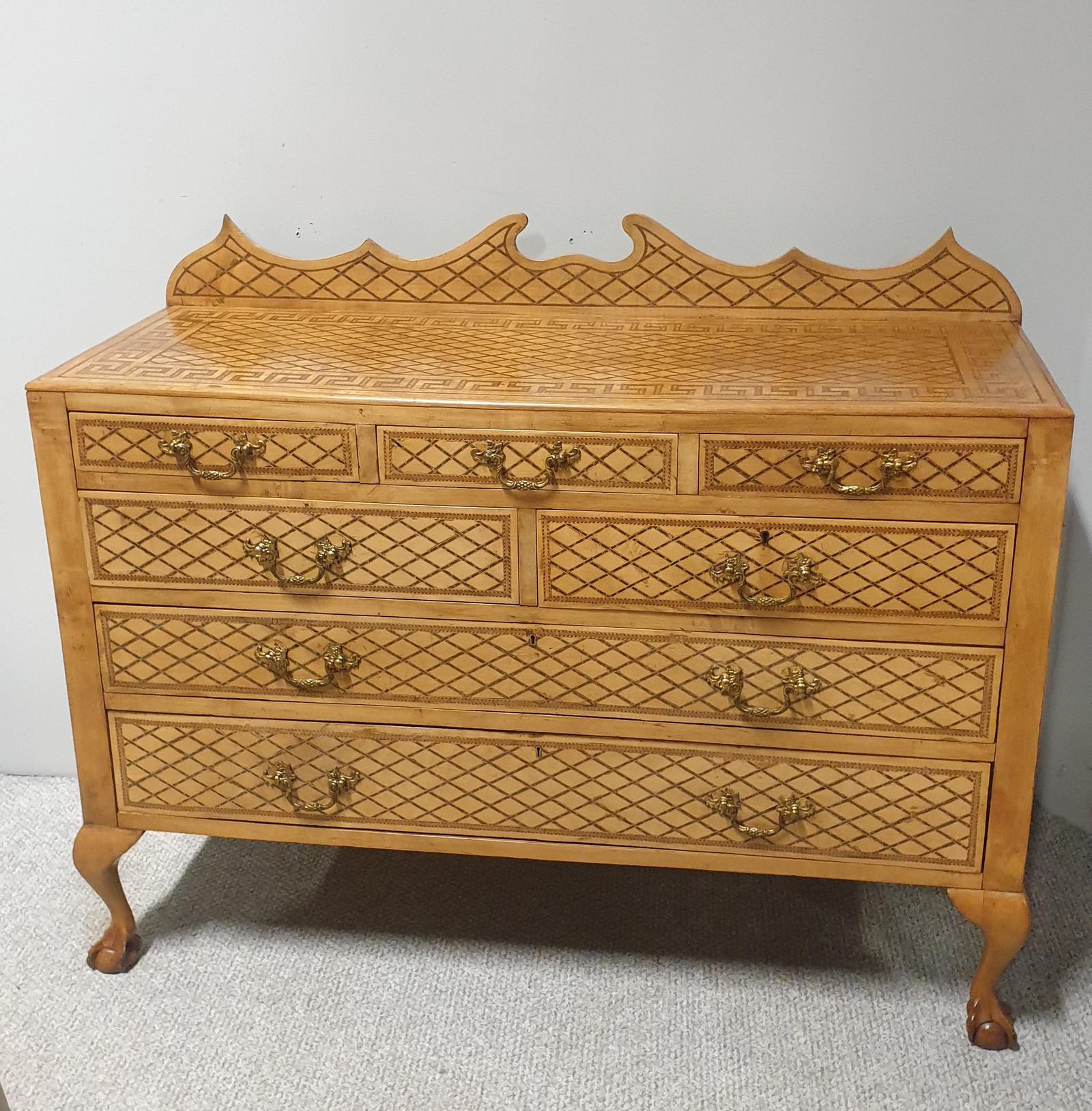 Seven drawer Swedish commode chest of drawers, standing on ball and claw legs, superb gilt handles, chris cross inlays, in very good original condition.