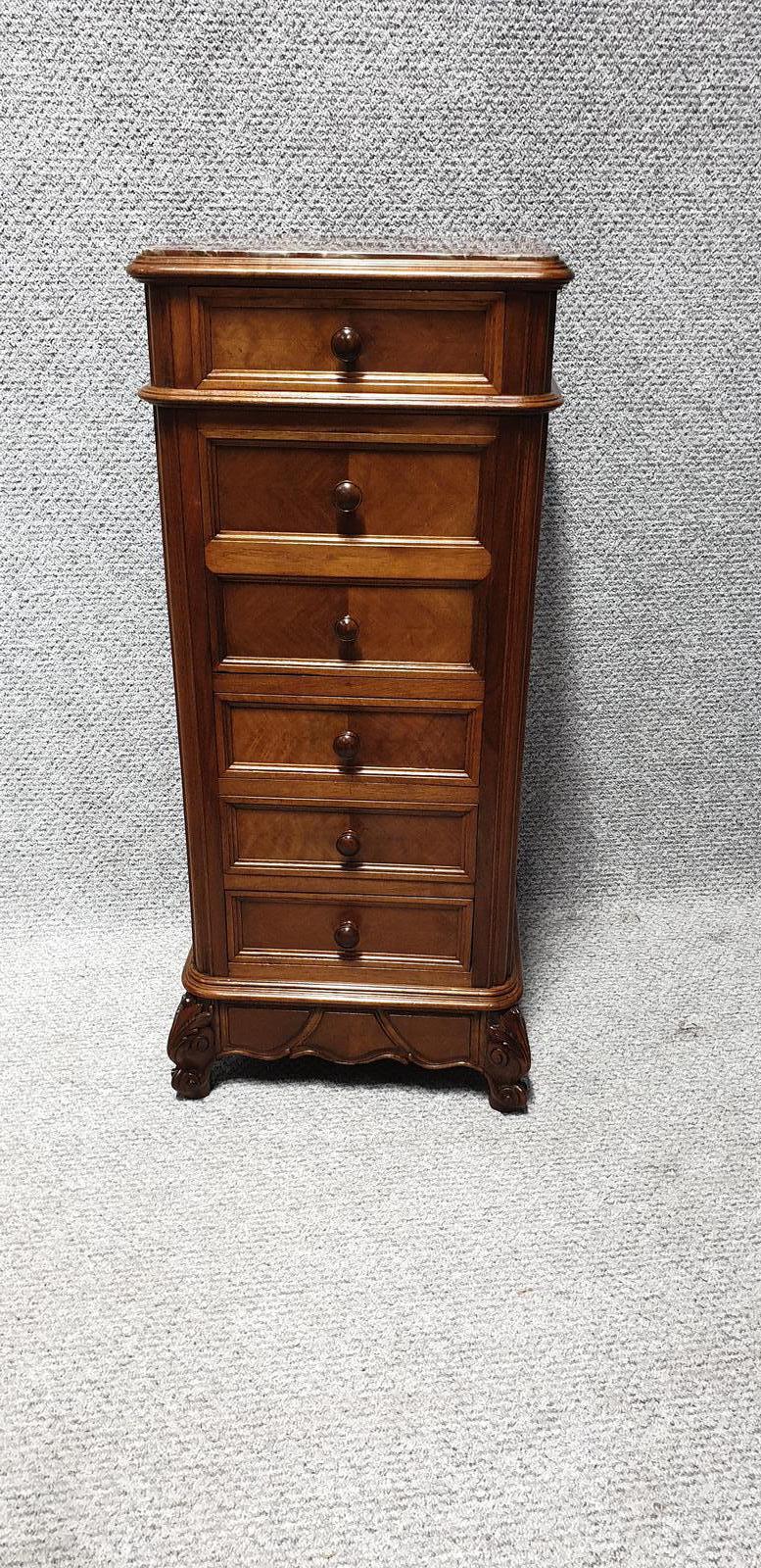 A very nice tall walnut chest of drawers with four opening and two false drawers, inset rouge marble, freestanding, in excellent original condition.