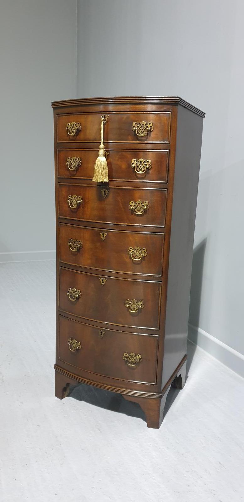 This is a tall slim bowed antique mahogany chest of six drawers with brass handles and escutions, original key, in overall very good condition